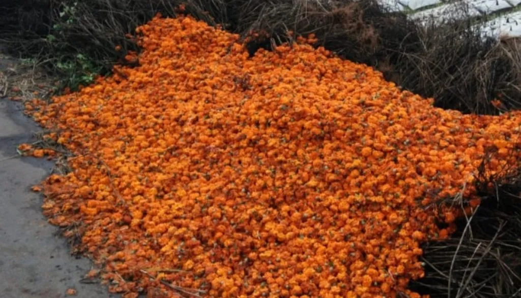 पावसाने झेंडू रस्त्यावर टाकण्याची वेळ