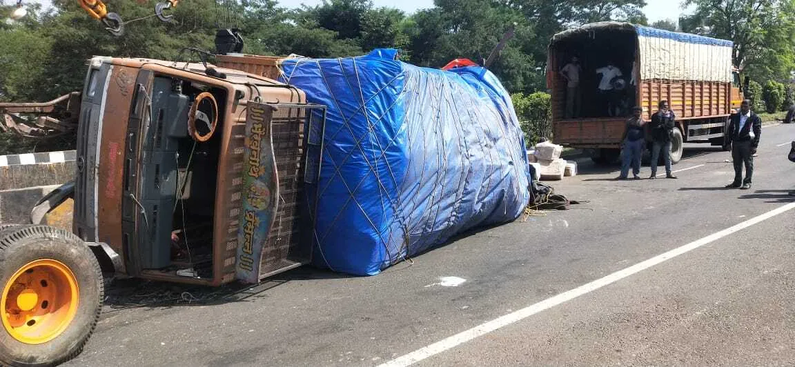 याबाबत घटनास्थळ व हायवे हेल्पलाईनकडून मिळालेल्या माहितीनुसार, बुधवारी पहाटे ४.३० च्या सुमारास कोल्हापूरहून धाग्यांचे बंडल घेऊन निघालेल्या ट्रकवरील चालकाचा ताबा अतीत गावच्या हद्दीत सुटला.ट्रक दुभाजकावर चढून तसाच पुढे असलेल्या ओढ्याच्या पुलाला जोरात जाऊन धडकून महामार्गावरच पलटी झाला.याचवेळी पाठीमागून येत असलेल्या खाजगी आरामबसच्या चालकाने अपघातग्रस्त ट्रक चुकविण्याचा प्रयत्न केला.