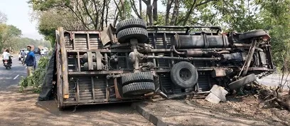 याबाबत घटनास्थळावरून मिळालेल्या माहितीनुसार सोमवारी सकाळी सांगलीहून मसाल्याची पोती भरून स्वराज माझदा ट्रक साताराकडे निघाला होता. दुपारी महामार्गावरील नागठाणे येथील उरमोडी नदीच्या पुलावरून ट्रक जात असताना त्याचा चालकाबाजूकडील पुढील टायर अचानक फुटला. त्यामुळे भरधाव वेगात असलेल्या या ट्रकवरील चालकाचा ताबा सुटल्याने तो पूल पास करून पुढे महामार्गावरील डिव्हायडरवर जाऊन पलटी झाला.