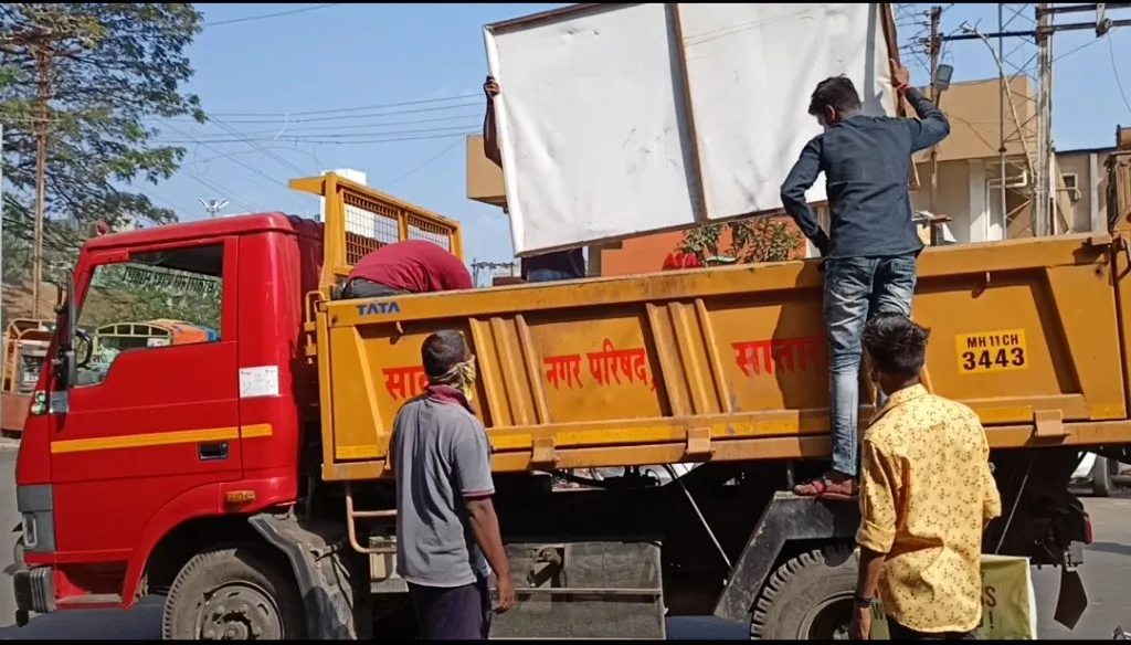 पालिकेचा अतिक्रमण हटाव विभाग भलताच सक्रिय झाला आहे. आदेश मिळताच काही क्षणात कारवाईच्या ठिकाणी हजर होतो अन् कारवाईला सुरुवात करतो. या विभागाकडे असलेल्या ठेक्याच्या कर्मचाऱ्यांना गेल्या काही दिवसांपूर्वी पगार नव्हता. ती समस्या नगराध्यक्षा माधवी कदम, उपनगराध्यक्ष मनोज शेंडे यांच्याकडे मांडली होती. त्यांच्याकडून प्रयत्नही झाला अन् ही टीम कामाला लागली. आज या टीमने शहरातील विना परवाना लावलेले फ्लेक्स काढले.
