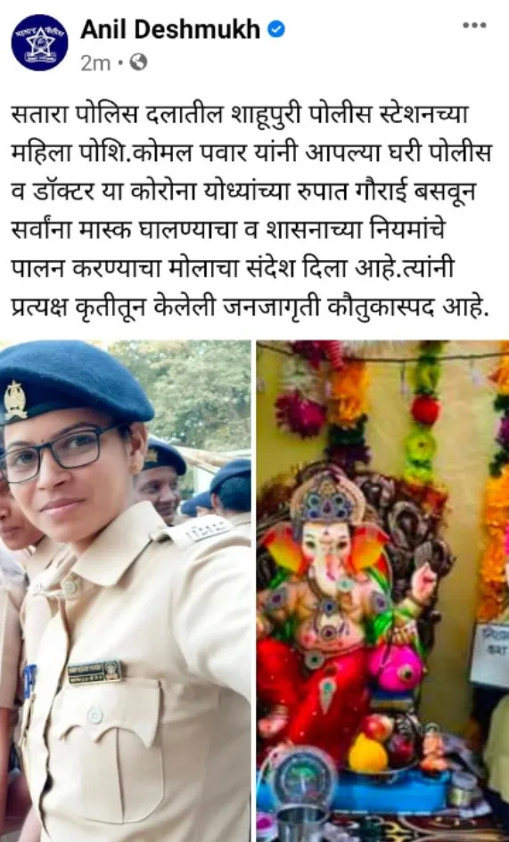 अशीच मनमोहक गौराईची सजावट शाहुपुरी पोलीस ठाण्यातील महिला पोलीस कोमल पवार यांनी त्यांच्या घरातील गौराई समोर केली. कोरोना योद्धा डॉक्टर, पोलीस यांचा देखावा त्यांनी गौराईसमोर केला आहे. त्यांनी केलेल्या या देखाव्यांचे कौतुक पोलीस अधीक्षक तेजस्वी सातपुते यांनी ट्विटरवरून तर राज्याचे गृहमंत्री अनिल देशमुख यांनी त्यांच्या सोशल अकाउंटवरुन केले आहे.
