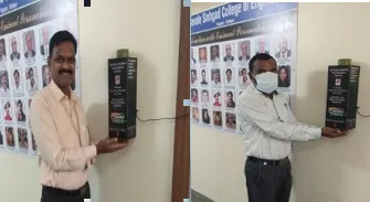सोलापूर शहर जिल्ह्यात कोरोनाचा विळखा दिवसेंदिवस वाढत चाललेला आहे. या काळात शिक्षक, विद्यार्थ्यांच्या सुरक्षेसाठी एन.बी. नवले सिंहगड कॉलेज ऑफ इंजिनियरिंग केगाव सोलापूर या महाविद्यालयमध्ये तिसऱ्या वर्षात शिकत असलेल्या इलेक्ट्रॉनिक्स अँड टेलिकम्युनिकेशन विभागातील विद्यार्थ्यांनी ॲटोमॅटीक टचलेस हॅन्ड सॅनीटायझर मशीन बनवली आहे. यामुळे कुणाचा संपर्क होणार नाही आणि महाविद्यालयात कोरोनाचा विळखा वाढणार नाही.