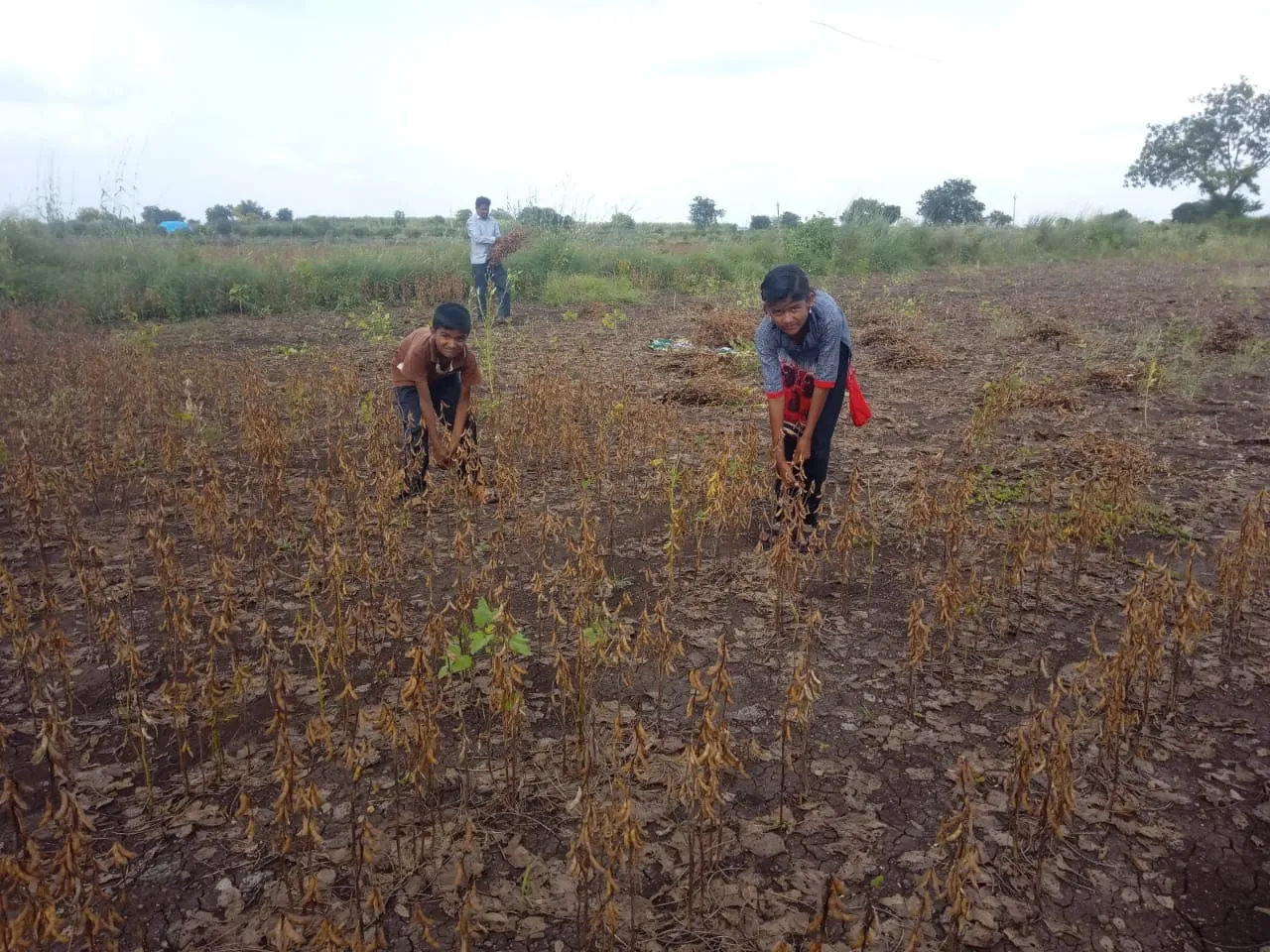 कोरोना महामारीच्या संसर्गामुळे गेल्या सात महिन्यांपासून शाळा बंद आहेत. शाळ बंद ,शिक्षण सुरू असा शासनाचा उपक्रम सुरू असला तरी ऑनलाईन शिक्षणात अनेेक अडथळे आहेत, कौटुंबिक समस्या आहेत. शेतीचा खरीप हंगाम सुरू आहे. त्यामुळे ग्रामीण भागात कुटुंबातील शाळकरी मुलांनी पालकांना आर्थिक दिलासा देत, शेतातच स्वावलंबी, आत्मनिर्भर भारताचे धडे गिरवत सोयाबीनच्या पिके काढणीसाठी शेतात पालकांना मदत करत असल्याचे दिसत आहेत.