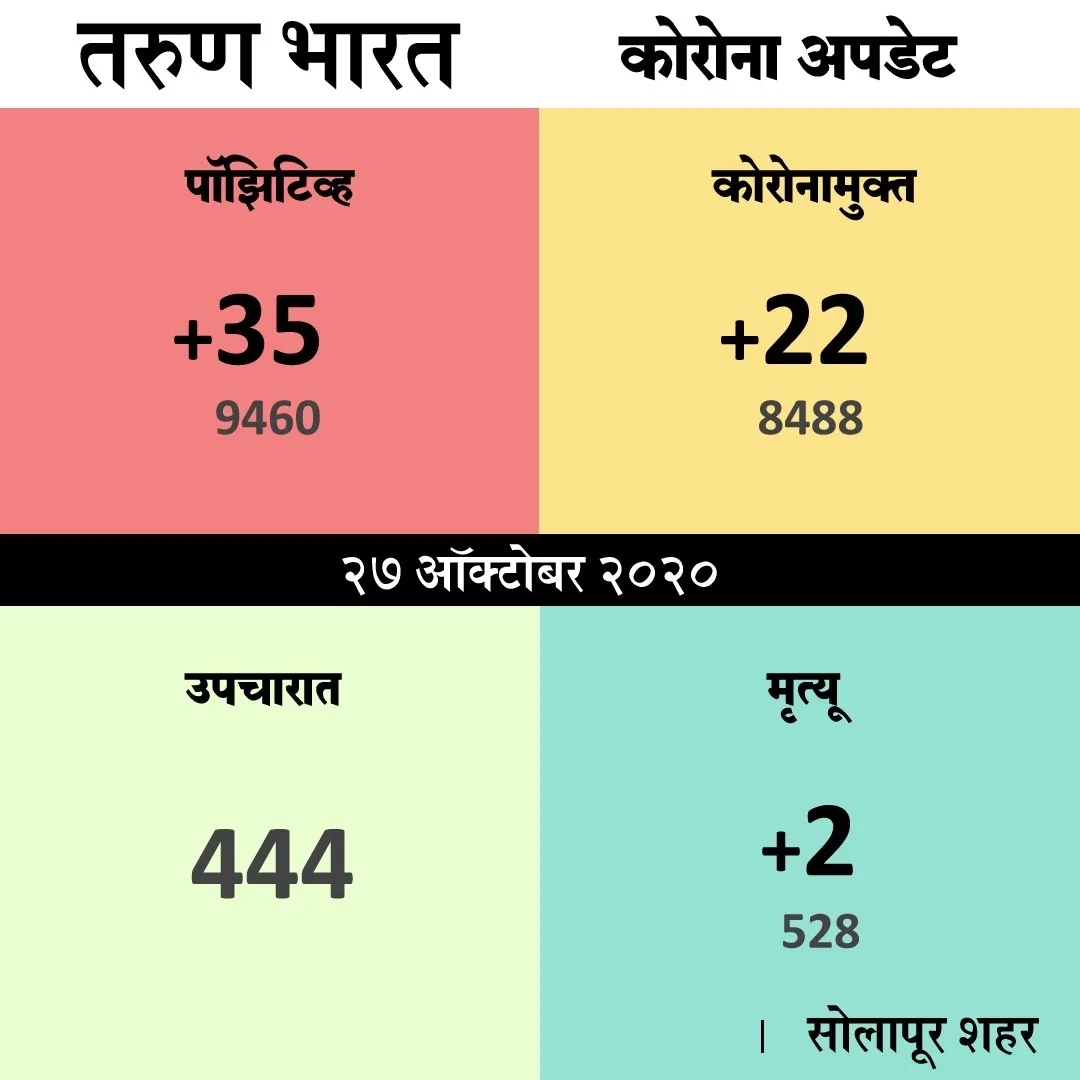 सोलापूर शहरात मंगळवारी 501 जणांचे अहवाल प्राप्त झाले. त्यातील 35 जणांचे अहवाल पॉझिटिव्ह तर 466 जणांचे अहवाल निगेटिव्ह आले. 35 पॉझिटिव्ह रुग्णांमध्ये 22 पुरुष तर 13 स्त्रियांचा समावेश आहे. शहरातील एकूण कोरोनाबाधित रुग्णांची संख्या 9460 झाली आहे.