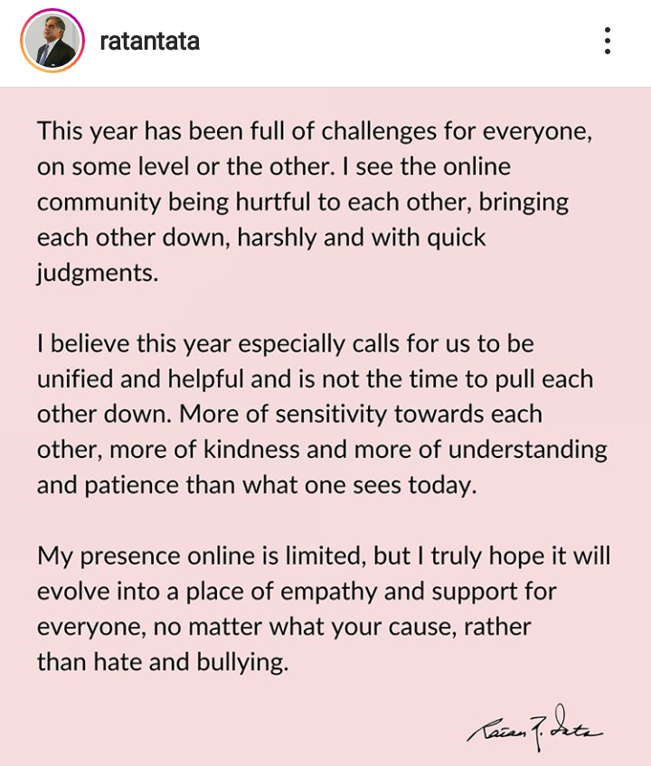 रतन टाटा यांनी इंस्टाग्रामवर पोस्ट केली आहे. ऑनलाईन ग्रुप एकमेकांचे नुकसान करत असून एकमेकांना दुय्यम समजत आहेत. पुढे ते म्हणतात हे वर्ष कोणत्या ना कोणत्या रूपात सर्वांसाठीच आव्हानात्मक आहे. दुसऱ्याला कमी कसे लेखता येईल याचीच चढाओढ इंटरनेट वर सुरू आहे.