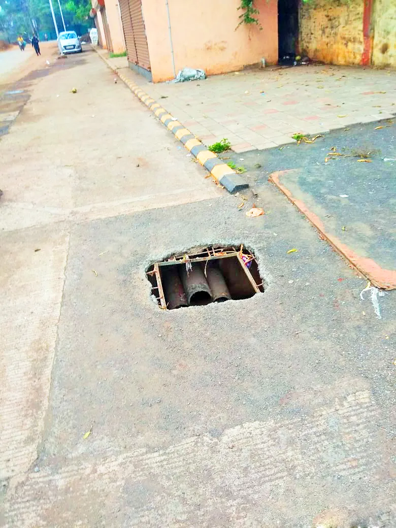 या मार्गावर रात्री विजेचा लपंडाव सुरू असतो. पथदीप काहीवेळा सुरू तर काहीवेळा बंद असतात. अंधारात या मार्गावरून जाताना नागरिक भगदाडात पडण्याचा धोका आहे. त्यामुळे संबंधितांनी या भगदाडांवर किमान झाकण बसविण्याची मागणी त्यांनी केली आहे. ही भगदाड उघडीच असून दुर्घटना घडण्याआधी प्रशासनाने याची दखल घेण्याची मागणी जी. के. खडबडी यांनी केली आहे.