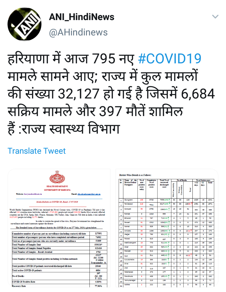 मिळालेल्या माहितीनुसार, संसर्गाचे प्रमाण 5. 80 टक्के तर रुग्ण बरे होण्याचे प्रमाणे 77.96 टक्के इतके आहे. काल आढळलेल्या 795 रुग्णांमध्ये गुरग्राममध्ये 108, फरिदाबादमध्ये 218, सोनपतमध्ये 50, रोहतक 00, भिवानी 11, रेवारी 91, करनाल 81, अंबाला 80, झज्जर 22, पलवल 00 , नूह 11, महेंद्रगड 16, हिसार 35, पानिपत 22, कुरुक्षेत्र 19, सिरसामधील 31, जींद 00, फतेहाबाद 00, पंचकुला 6, कैथल 2 आणि चरखी दार्दीमधील 2 जणांचा समावेश आहे.