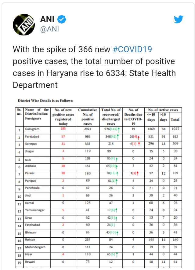 मिळालेल्या माहितीनुसार, कालच्या दिवसात आढळलेल्या 336 रुग्णांपैकी गुरुग्राम मध्ये सर्वाधिक 185, फरिदाबाद मध्ये 57, सोनपतमध्ये 31, झज्जर 3, नुह 5, अंबाला 28, पलवण 28, पानिपत 2, जिंद 1, यमुनानगर 5, फतेहाबाद 2, हिसार 4, चरखीदादरी 1, कैथल 11 आणि कुरुक्षेत्र मधील 3 रुग्णांचा समावेश आहे.