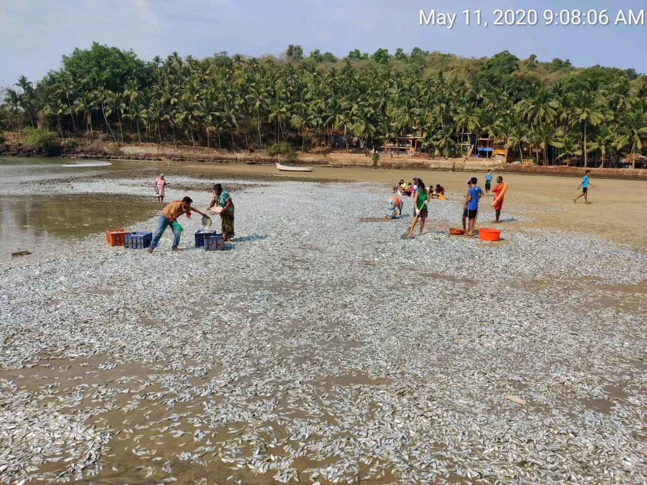 स्थानिक मच्छिमारांनी घातलेल्या रापणीच्या जाळात ही मासळी अडकली. मिश्र प्रकारची ही मासळी बंपर होती. संपूर्ण किनाराच या मासळीने व्यापला होता. त्यामुळे किनाऱयावर लोकांचीही गर्दी पडली होती. या मासळीचे काय करायचे असा प्रश्न निर्माण झाला होता. काहीनी शक्य तेवढी मासळी उचलली. अतिरिक्त मासळीचा प्रश्न समुद्राला भरती आल्याने शेवटी मिटला. मात्र, मृत माशांची अडचण तशीच राहिली. सोमवारी सकाळी हा प्रकार घडला. स्थानिक पंचायतीलाही या प्रश्नात लक्ष घालावे लागले.