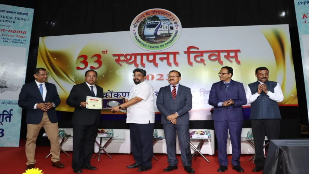 कोकण रेल्वेच्या 33व्या स्थापना दिनाचे औचित्य साधत कोकण रेल्वेच्या स्थापने पासून रेल्वेसाठी मोठ योगदान देणाऱ्या व्यक्तींना सन्मानित करण्यात आले.कोकण रेल्वेच्या जनसंपर्क विभागाचे उपमहाप्रबंधक गिरीश करंदीकर यांना यावेळी कोकण रेल्वेचे चेअरमन तथा व्यवस्थापकीय संचालक संजय गुप्ता यांच्या हस्ते आणि अन्य संचालकांच्या उपस्थितीत विशेष पुरस्काराने सन्मानित करण्यात आले.