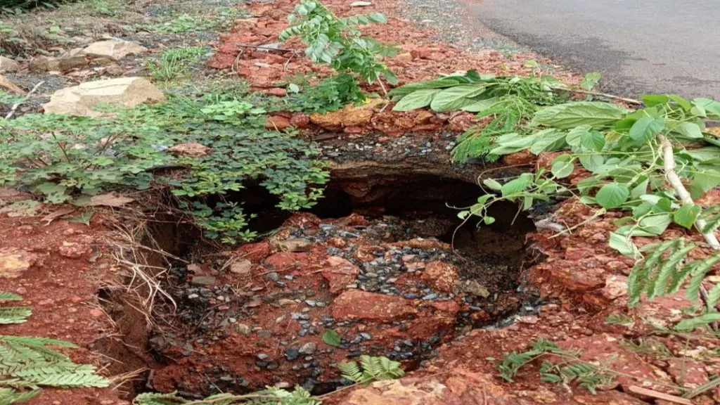 पाडलोस मडुरा रस्त्यावरील पाडलोस केणीवाडा येथे रस्त्याच्या बाजूला सुमारे पाच फुटी भगदाड पडले आहे. रात्री अपरात्री वाहनास बाजु देताना अपघात होण्याची शक्यता निर्माण झाली आहे. सार्वजनिक बांधकाम विभागाने याकडे तत्काळ लक्ष देत अपघातापूर्वी धोकादायक भगदाड बुजविण्याची मागणी ग्रामस्थांमधून होत आहे. पाडलोस केणीवाडा डोंगराचीकोण येथे बांद्याच्या दिशेने उजव्या बाजूला पाच फुटी भगदाड पडले. मान्सूनपूर्व पावसाने साईड पट्टीच्या केलेल्या कामाचा दर्जा उघडा पाडला. दगड व मातीच्या साह्याने साईड पट्टीचे काम करण्यात आले परंतु ते निकृष्ट ठरल्यामुळेच भगदाड पडल्याचा आरोप ग्रामस्थांनी केला. या ठिकाणी मोरीपूल असल्यामुळे वाहनांना बाजू देताना वाहन पाच फुटी भगदाडामध्ये जाण्याची शक्यता आहे. नवख्या वाहन चालकाला तर भगदाडाचा अंदाज सुद्धा येऊ शकत नाही. त्यामुळे सार्वजनिक बांधकाम विभागाने याकडे तत्काळ लक्ष देत अपघात होण्यापूर्वी भगदाड बुजविण्याची मागणी ग्रामस्थांनी केली आहे.