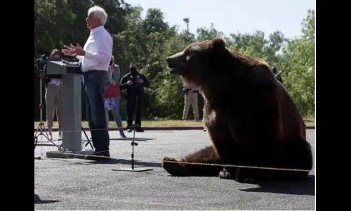 निवडणुकीच्या प्रचारसभा यशस्वी ठराव्यात याकरता उमेदवार काहीतरी अनोखे करण्यासाठी धडपडत असतात. अमेरिकेतील कॅलिफोर्नियाचे गव्हर्नर गेविन न्यूसम यांना हटविण्यासाठी होत असलेल्या ‘रिकॉल’ निवडणुकीसाठी एका रिपब्लिकन उमेदवाराने केलेली प्रचारसभाच व्हायरल झाली आहे. स्वतःच्या या सभेत उद्योजक जॉन कॉक्स एका 500 किलो वजनाच्या अस्वलासह पोहोचले होते.