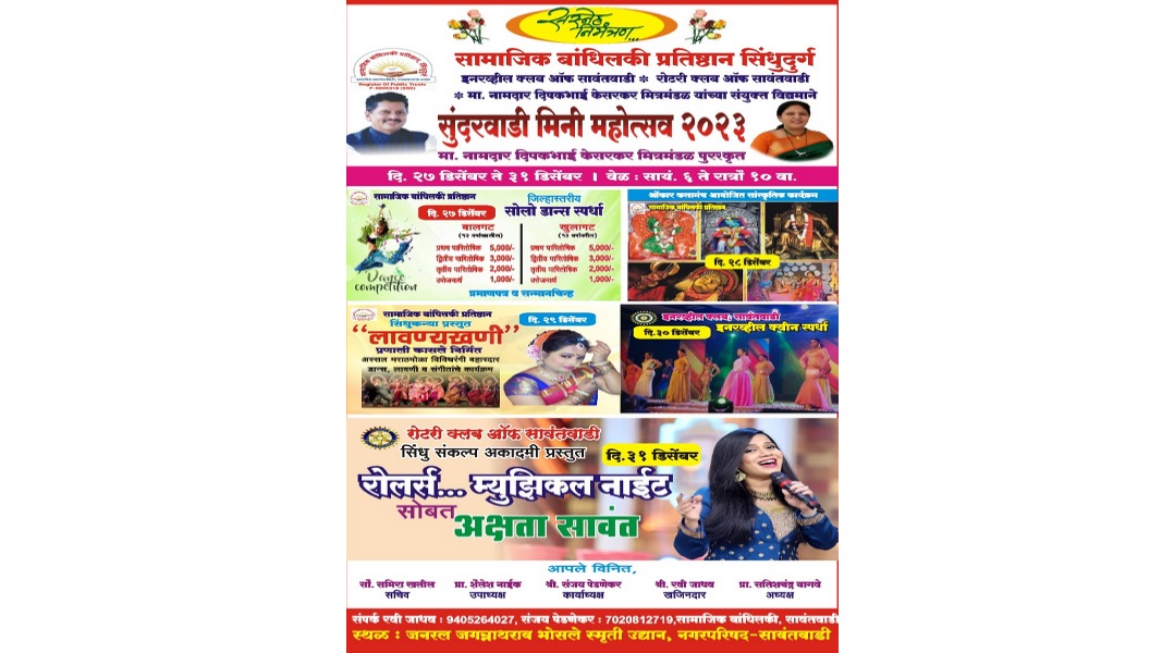 सावंतवाडी शहरामध्ये चार वर्षानंतर शहरवासीयांच्या मनोरंजनासाठी विविध कार्यक्रमांनी भरगच्च असलेला सुंदरवाडी मिनी महोत्सव दिनांक 27 ते 31 डिसेंबरला सावंतवाडीत रंगणार आहे . या कार्यक्रमाचे आयोजन सामाजिक बांधिलकी प्रतिष्ठान, इनरव्हील क्लब ऑफ सावंतवाडी, रोटरी क्लब ऑफ सावंतवाडी व दीपक भाई केसरकर मित्रमंडळ यांच्या संयुक्त विद्यमाने करण्यात आले आहे . विविध पदार्थांचे फूडस्टॉल व घरगुती वस्तूंचे स्टॉल असणार आहेत. दिनांक 27 डिसेंबरला बाल गट व खुला गट यांच्यामध्ये जिल्हास्तरीय सोलो डान्स ही रोमांचक स्पर्धा होणार आहे, तर 28 डिसेंबरला ओंकार कलामंच यांचा सदाबहार सांस्कृतिक कार्यक्रम होणार आहे. तसेच 29 डिसेंबर रोजी प्रणाली कासले निर्मित ” लावण्यखणी” हा कार्यक्रम होणार आहे. 30 डिसेंबर रोजी इनरव्हील क्लब यांचा इनरव्हील ब्युटीक्वीन स्पर्धा होणार आहे. तर शेवटच्या दिवशी 31 डिसेंबरला अक्षता सावंत यांचा रोलर्स म्युझिक नाईट ऑर्केस्ट्रा होणार आहे. तरी सावंतवाडी शहरातील रसिक प्रेक्षकांनी या रंगबहार कार्यक्रमांचा लाभ घ्यावा असे आवाहन सामाजिक बांधिलकीचे कार्यकर्ते रवी जाधव यांनी केले आहे. स्टॉल व स्पर्धेसाठी रवी जाधव यांच्याशी संपर्क साधा :- 9405264027