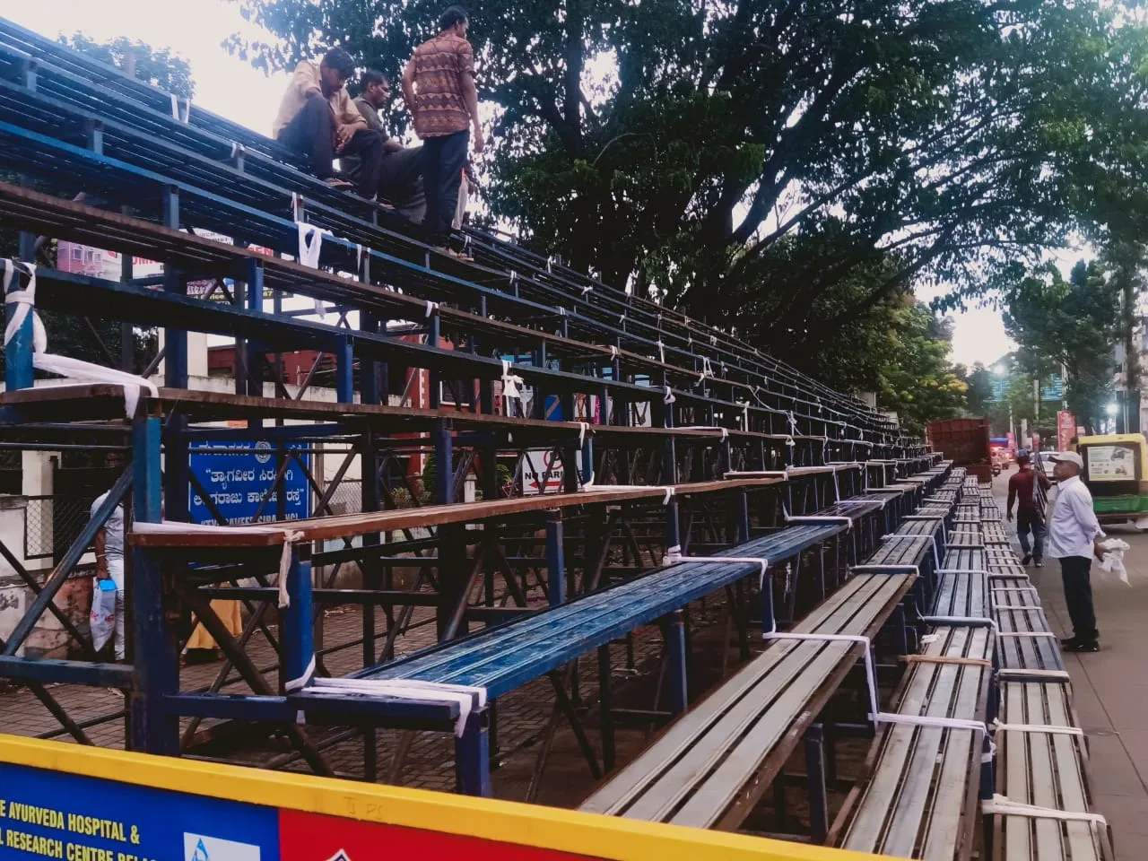 बेळगाव : प्रशासनाकडून अनंत चतुर्दशी दिवशीच्या विसर्जनाची तयारी केली जात आहे. रविवारी धर्मवीर संभाजी चौक येथे भाविकांसाठी गॅलरी उभारण्यात आली. त्यामुळे बेळगावसह आसपासच्या परिसरातून आलेल्या भाविकांना गॅलरीमधून गणेशमूर्ती तसेच मिरवणूक पाहता येणार आहे. मंगळवार दि. 17 रोजी घरगुतीसह सार्वजनिक गणेशमूर्तींचे विसर्जन होणार आहे. यासाठी बेळगाव सर्वच विसर्जन तलावांवर बॅरिकेड तसेच निर्माल्य कुंड, प्रकाश योजना बसविण्यात आली आहे. नागरिकांची एकाचवेळी गर्दी होऊ नये यासाठी कपिलेश्वर मंदिर परिसरात गर्दीचे नियंत्रण करण्यासाठी बॅरिकेड्स लावण्यात आले आहेत. दोन वर्षांपूर्वी धर्मवीर संभाजी चौकात गॅलरी उभारण्यात आली नव्हती. यामुळे बेळगावच्या गणेशभक्तांना जागा मिळेल तेथे उभे राहून विसर्जन मिरवणूक पहावी लागली. त्यामुळे गणेशभक्तांमधून नाराजीही व्यक्त करण्यात आली. यावर्षी मात्र दोन दिवस आधीच धर्मवीर संभाजी चौकात गॅलरी तसेच स्टेज उभारण्यात आले आहे.