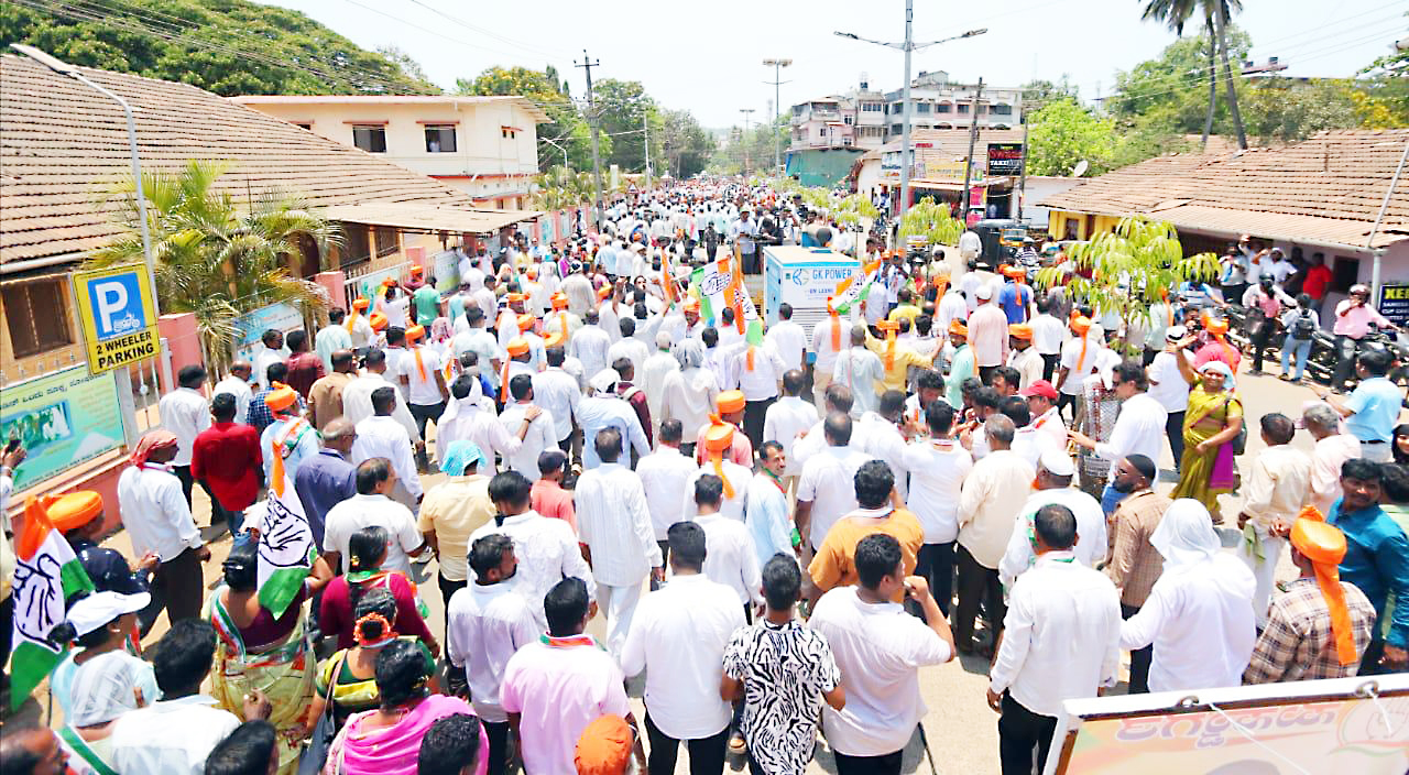 त्यानंतर अकरा वाजता कमलादेवी मैदानावरून भव्य रोड शोला सुरुवात झाली. यावेळी झांजपथक, तसेच डीजेच्या गजरात रॅलीला सुरुवात झाली. यावेळी वाहनावर स्वत: अंजली निंबाळकर, आर. व्ही. देशपांडे, कारवार जिल्हा पालकमंत्री मंकाळू वैद्य यांच्यासह विविध नेते उपस्थित होते. शहरातील प्रमुख रस्त्यावरून ही रॅली काढण्यात आली. या रॅलीवेळी शहरातील महापुरुषांच्या पुतळ्dयांना अभिवादन करण्यात आले. यात छत्रपती शिवाजी महाराज, डॉ. बाबासाहेब आंबेडकर, सुभाषचंद्र बोस यांच्या पुतळ्dयांना मालार्पण करून अभिवादन करण्यात आले. यावेळी कारवार शहर काँग्रेसमय झाले होते. सहभागी महिला व पुरुष कार्यकर्त्यांच्या डोक्यावर काँग्रेसची टोपी, गळ्dयात पट्टा, तसेच हातात काँग्रेसचा झेंडा घेऊन कार्यकर्ते रॅलीत सहभागी झाले होते. सकाळी 11 वाजता सुरू झालेली मिरवणूक दुपारी 2 वाजता संपली. भर रखरखत्या उन्हातही कार्यकर्ते या मिरवणुकीत सहभागी झाले होते. शहरातील प्रमुख रस्त्यांवरून रॅली काढण्यात आल्यानंतर शिवाजी चौकात रॅलीचे भव्य सभेत रुपांतर झाले. या ठिकाणी उपस्थित काँग्रेसच्या नेत्यांनी अंजली निंबाळकर यांना निवडून देण्याचे आवाहन केले. काँग्रेसच्या उमेदवार अंजली निंबाळकर यांनी भगवी साडी व भगवा फेटा बांधला होता. तर काँग्रेसच्या जास्तीत जास्त कार्यकर्त्यांनी भगवे फेटे बांधले होते. त्यामुळे चर्चेचा विषय बनला होता. पत्रकारांनीही याबाबत अंजली निंबाळकर यांना छेडले. त्यावेळी भगवा हा सर्व हिंदूंचा रंग असून त्याग आणि बलिदानाचे प्रतीक आहे. म्हणूनच देशाच्या तिरंग्यातही भगव्याला वरचे स्थान आहे. म्हणूनच आपण भगवा वेश आणि आणि भगवा फेटा परिधान केला आहे. भगवा रंग हा कुणाची मक्तेदारी नसून प्रत्येक हिंदूंचे प्रतीक आहे, असे त्यांनी पत्रकारांना सांगितले. सकाळी नऊ वाजल्यापासूनच कार्यकर्ते कारवार येथील कमलादेवी मैदानावर व जिल्हाधिकारी कार्यालयाकडे जमण्यास सुरुवात झाली होती. सकाळी 11 वाजेपर्यंत हजारोंच्या संख्येने कार्यकर्ते शक्तिप्रदर्शनात सहभागी झाले होते. प्रचंड उष्ण हवामान असूनदेखील कार्यकर्ते शेवटपर्यंत या शक्तिप्रदर्शनात सहभागी झाले होते.
