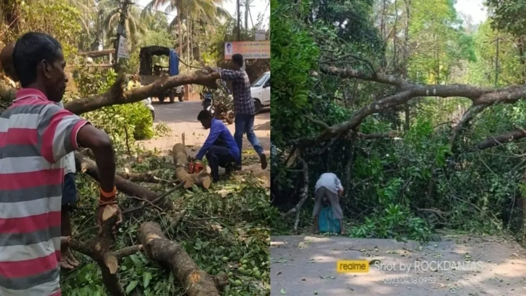 भटवाडी लक्ष्मीनारायण मंदिर जवळ आज सकाळी नऊ वाजता भले मोठे आंब्याचे झाड रस्त्यावर कोसळले त्यात एक मोटर सायकल चालक बाल बाल बचावला त्यामुळे मोठी जीवित हानी टळली चालू विद्युत लाईन तुटून रस्त्यावर पडल्या होत्या सामाजिक बांधिलकीच्या टीमने तत्परता दाखवत सामाजिक बांधिलकीचे संजय पेडणेकर व शाम हंडळकर तत्काळ घटनास्थळी दाखल होऊन सर्वप्रथम एमईसीबीला फोन करून रस्त्यावरची लाईन बंद करायला लावली त्यानंतर कटरच्या साह्याने अवघ्या तासाभरात झाड कट करून वाहन चालकांना व ग्रामस्थांना रस्ता मोकळा करून दिला.सामाजिक कार्यकर्ते व काँग्रेसचे तालुकाध्यक्ष महेंद्र सांगेलकर यांचेही खूप मोठे सहकार्य लाभले तसेच शानू सुभेदार बंड्या केरकर ,संतोष कुलकर्णी, प्रसाद राणे सहकार्य लाभले तसेच एमईसीबी चे कर्मचाऱ्यांनी खूप मोठी कसरत करून अवघ्या चार तासात लाईट सुरू केली त्यांचीही भटवाडीतील ग्रामस्थ व सामाजिक बांधिलकी कडून विशेष कौतुक करण्यात आले.