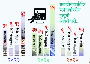 उपलब्ध माहितीनुसार 2023 मध्ये 53 जणांचा तर 2024 मध्ये 61 जणांचा मृत्यू झाला आहे. चालू वर्षाच्या पहिल्या तीन महिन्यांत 15 जण दगावले आहेत. यामध्ये 9 जणांनी आत्महत्या केल्या आहेत. यापैकी 8 जणांची ओळख पटली असून एका मृतदेहाची ओळख पटली नाही. तर मार्चअखेरपर्यंत 5 जणांचा आकस्मिक मत्=यू झाला आहे. या सर्व 5 जणांची ओळख पटली आहे. तर एकाचा नैसर्गिक मृत्यू झाला आहे. 2023 मध्ये रेल्वेस्थानक परिसरात 9 जणांचा आकस्मिक मृत्यू झाला आहे. यापैकी 8 जणांची ओळख पटली असून एकाची सव्वादोन वर्षांनंतरही ओळख पटली नाही. रेल्वेखाली आत्महत्या करणाऱ्या 31 जणांपैकी 26 जणांची ओळख पटली आहे. उर्वरित 5 जण कोण? याची ओळख पटली नाही. 13 जणांचा नैसर्गिक मृत्यू झाला असून यापैकी 10 जणांची ओळख पटली आहे. उर्वरित 3 जणांची ओळख पटली नाही.