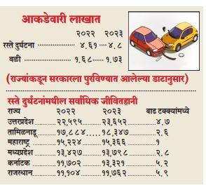 भारतात रस्ते दुर्घटनांमध्ये जाणाऱ्या बळींचा आकडा चिंताजनक आहे. 2023 मध्ये देशात 1,73,000 लोक रस्ते दुर्घटनांमध्ये स्वत:चा जीव गमावून बसले आहेत. यातील जवळपास 55 टक्के बळी हे केवळ 6 मोठी राज्ये उत्तरप्रदेश, तामिळनाडू, महाराष्ट्र, कर्नाटक, मध्यप्रदेश आणि राजस्थानात गेले आहेत. राजस्थानात रस्ते दुर्घटनांमध्ये सर्वाधिक वाढ दिसून आली आहे. तेथे 2022 च्या तुलनेत 2023 मध्ये रस्ते दुर्घटनांमध्ये होणाऱ्या मृत्यूंमध्ये 6 टक्क्यांची वाढ झाली आहे. केंद्रीय रस्ते परिवहन मंत्री नितिन गडकरी यांनी या वाढणाऱ्या आकड्यावर चिंता व्यक्त करत अधिकारी आणि इंजिनियर्सना रस्ते दुर्घटनांची चौकशी करणे आणि सुधारणात्मक पाऊल उचलण्याचा आग्रह केला आहे.