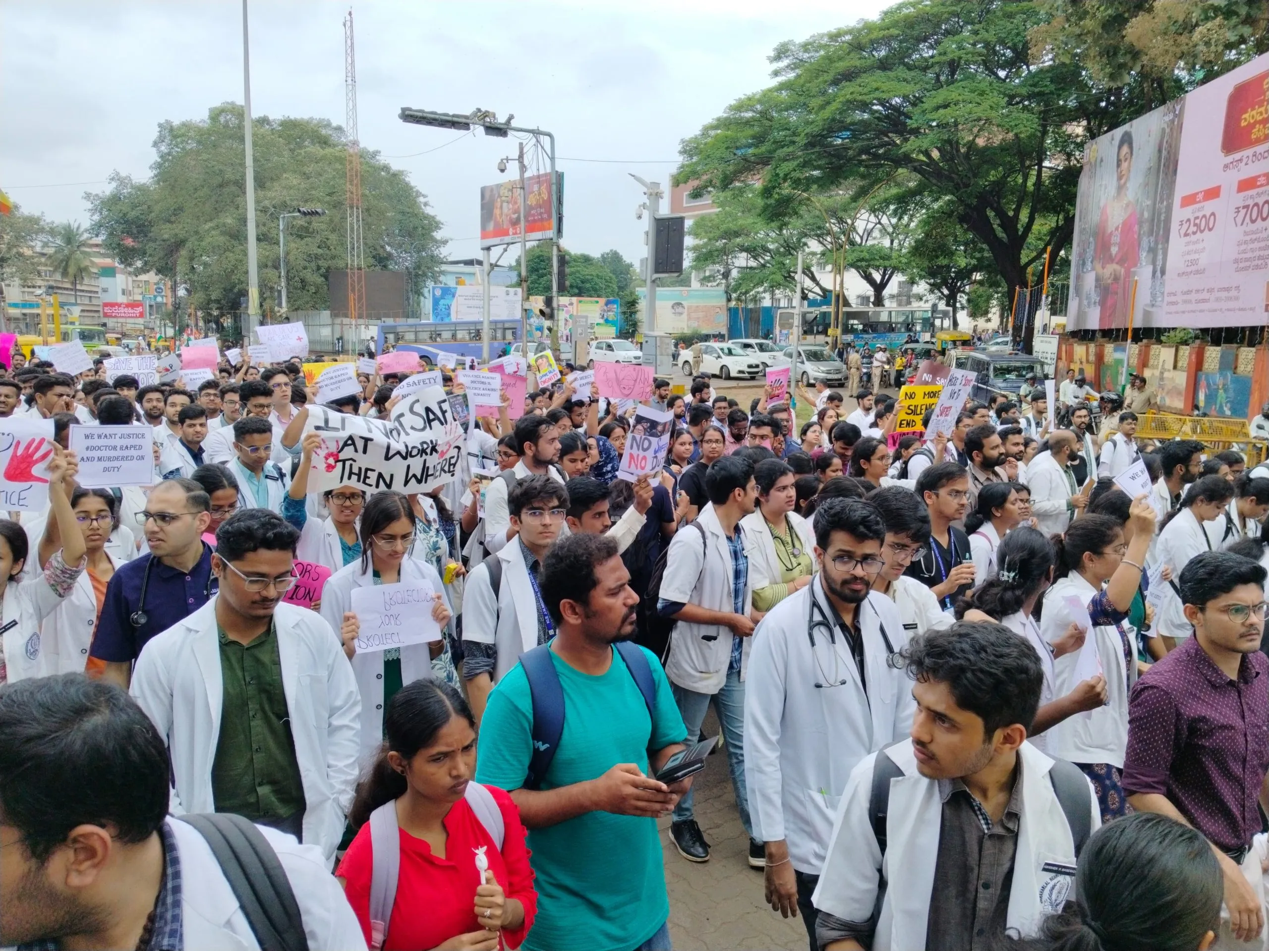 याप्रसंगी डॉक्टरांनी सदर घटनेच्या निषेधार्थ जोरदार घोषणा दिल्या. ‘वुई वाँट जस्टीस’, ‘डॉक्टरांवर हल्ला म्हणजे मानवतेवर हल्ला’, ‘महिलांवरील अत्याचार रोखा’, ‘सुरक्षितता नसेल तर कामही करणार नाही’ अशा आशयाचे फलक त्यांनी हातात धरले होते. या ठिकाणी मोर्चाचे नेतृत्व करताना डॉ. एम. बी. बेल्लद यांनी सदर घटनेचा तीव्र शब्दात निषेध करून, डॉक्टरांना गृहित धरणे बंद करा, न्यायाला विलंब म्हणजे न्याय नाकारणे असाच अर्थ होतो. सुरक्षित वातावरण नसेल तर डॉक्टर काम करू शकणार नाहीत आणि डॉक्टरांनी काम थांबवले तर समाजाचे आरोग्य धोक्यात येईल, असे सांगून यापुढे अशा घटना घडणार नाहीत, याची काळजी सरकारने घ्यावी, अशी मागणी केली.