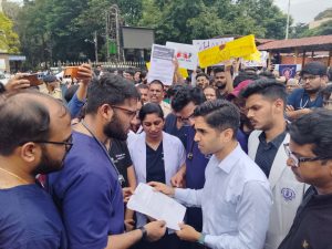 कोलकाता येथे आर. जी. कार वैद्यकीय महाविद्यालयातील महिला डॉक्टरवर निर्घृण बलात्कार करून तिची हत्या झाल्याच्या प्रकरणाची लवकरात लवकर चौकशी व्हावी व आरोपीवर कठोर कारवाई केली जावी, या व अन्य मागण्यांसह काहेर विद्यापीठाच्या जे. एन. मेडिकल कॉलेजचे डॉक्टर व विद्यार्थी संघटनेच्या नेतृत्वाखाली शेकडो डॉक्टरांनी जिल्हाधिकारी कार्यालयावर धडक मोर्चा काढला व जिल्हाधिकाऱ्यांना निवेदन दिले.
