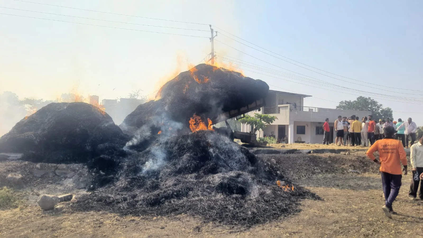 हलगा शिवारात पिंजराने भरलेल्या ट्रक्टरला सर्व्हिस वायरचा स्पर्श झाल्यामुळे ट्रक्टरमधील गवताला आग लागल्याची घटना रविवार दि. 26 रोजी घडली. सुदैवाने या घटनेत कोणतीही जीवितहानी झाली नसली तरी ट्रक्टर ट्रॉलीमधील गवत पूर्णपणे जळले आहे. यामुळे शेतकऱयाचे मोठे नुकसान झाले आहे. बस्तवाड शेतवडीतील वाळलेले गवत शिनोळी खुर्द येथील कृष्णा खांडेकर हे शेतकरी घेऊन जात होते. दुपारी चारच्या सुमारास हलगा गावाजवळ सदर ट्रॉलीतील गवत सर्वीस वायरला लागल्याने या ट्रॉलीतील गवताला आग लागली. आगीने रुद्रावतार धारण केल्यामुळे परिसरातील शेतकरी जमा झाले व यातील इंजिनला बाहेर काढले गेले. तात्काळ शेतकऱयांनी ट्रक्टरो इंजिन बाहेर काढल्यामुळे कोणताही जीवितहानी झाली नाही. परंतू कृष्णा खांडेकर याला इंजिन काढतेवेळी आगीमुळे थोडी दुखापत झाली आहे. आगीत ट्रॉलीतील संपूर्ण गावत व ट्रॉली, ट्रॉलीची चाके जळलेली आहेत. यामुळे खांडेकर (शिनोळी खुर्द ता. चंदगड) यांचे सुमारे एक लाख रुपयांचे नुकसान झाले. ग्रा. पं. अध्यक्ष सदानंद बिळगोजी यांनी अग्निशमन दलाला घटनेची माहिती दिल्यामुळे लागलीच अग्निशमन दलाचे दोन बंब घटनास्थळी दाखल झाले व ही आग विझविण्यात आली. यावेळी हलगा येथील शेतकरी व ग्रामस्थ उपस्थित होते.