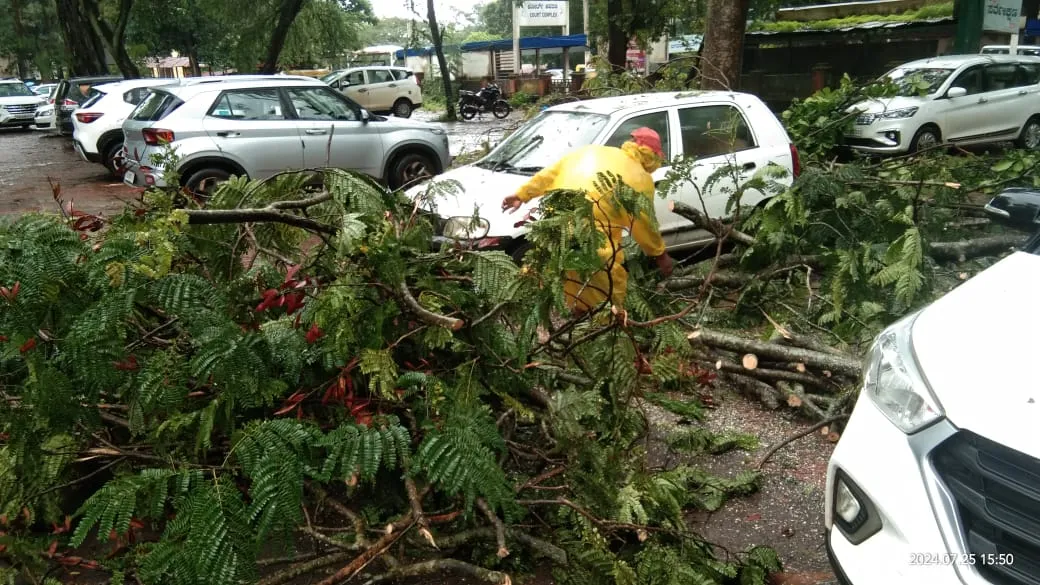 बेळगाव : जोरदार पाऊस आणि वाऱ्यामुळे जेएमएफसी न्यायालयाच्या आवारातील झाड कोसळून कारचे नुकसान झाल्याची घटना गुरुवारी घडली आहे. यावेळी तेथे कोणी नसल्याने अनर्थ टळला आहे. यापूर्वी अशाप्रकारे झाडे कोसळून वाहनांचे नुकसान झाल्याच्या घटना घडल्या आहेत. तेव्हा वनविभागाने सर्व्हे करून धोकादायक असलेली झाडे हटवावीत, अशी मागणी होत आहे. जेएमएफसी न्यायालयाच्या आवारात जिल्हा कौटुंबिक न्यायालयाची इमारत उभारण्यात आली आहे. त्या इमारतीसमोरच अनेक झाडे आहेत. त्या झाडांच्या परिसरात पेव्हर्स बसविण्यात आले आहेत. त्याच ठिकाणचे झाड कोसळले. या परिसरात वकील व पक्षकार वाहने पार्किंग करतात. गुरुवारी झालेल्या पावसामुळे झाड कोसळले आहे. त्यानंतर तातडीने कामगारांना बोलावून झाड हटविण्यात आले. या घटनेत कारचे नुकसान झाले आहे.