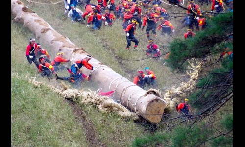 लोक यावर सवार होत ओंडक्यासह खालच्या दिशेने जाऊ लागतात. हा ओंडका सरकताना अनेक लोकांचा खाली पडून किंवा चिरडून मृत्यू देखील होत असतो. खाली आल्यावर या देवदारच्या ओंडक्यांना दोरखंडाद्वारे खेचून नदी पार करत चार पवित्र तीर्थस्थानापर्यंत नेण्याची प्रथा आहे.