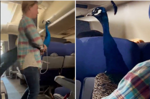 सोशल मीडियावर एक व्हिडिओ वेगाने व्हायरल होत आहे. या व्हिडिओत एक महिला विमानात स्वत:सोबत मोर घेऊन पोहोचल्याचे दिसून येते. ही घटना एका सहप्रवाशाने मोबाइलच्या कॅमेऱ्यात कैद केली. तिने हा मोर स्वत:च्या मांडीवर घेत विमानातून प्रवास केल्याची माहिती समोर आली आहे. हा व्हिडिओ आता अनेक सोशल मीडिया प्लॅटफॉर्म्सवर व्हायरल होत आहे. या व्हिडिओतील मोराच्या सौंदर्याचे अनेक लोकांनी कौतुक केले आहे.