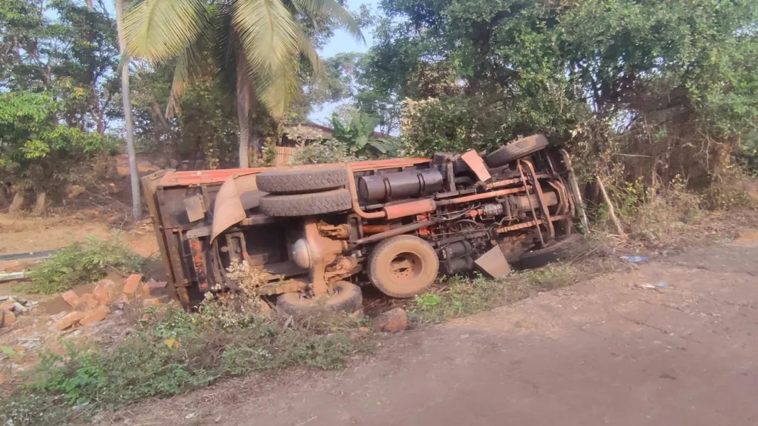 मालवण कोळंब येथील पुलानजीक वाळूने भरलेला डंपर वरील चालकाचे नियंत्रण सुटल्याने डंपर मुख्य रस्त्यावरून खाडी पात्राच्या दिशेने असलेल्या उताराच्या रस्त्यावरून उलट्या दिशेने खाली जाऊन पलटी झाल्याची घटना आज सकाळी सहा वाजण्याच्या सुमारास घडली. या अपघातात सुदैवाने चालक सुजितकुमार हा बचावला आहे.या अपघातानंतर पोलीस व महसूल विभागाच्या अधिकाऱ्यांनी घटनास्थळी हजर होत पाहणी केली. याबाबतचा पंचनामा करण्यात येत असून पुढील कार्यवाही सुरु आहे.
