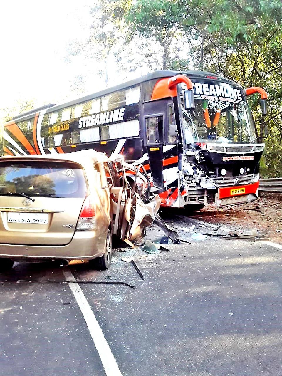 धारबांदोडा : नंद्रण मोले येथे राष्ट्रीय महामार्गाच्या वळणावर लक्झरी बस व इनोवा कार यांच्यात झालेल्या अपघातात कारचालक मोहम्मद गौस (40) गंभीर जखमी झाला आहे .सदर अपघात मंगळवारी सकाळी सुमारे 7.45 सुमारास घडला. कुळे पोलिसांनी दिलेल्या माहितीनुसार, इनोव्हा कार क्रमांक उA 05A 9977 ही मडगाव हून हुबळीला एका लग्न समारंभाला जात होती. या कारमध्ये एकूण तीन प्रवासी होते. ते किरकोळ जखमी झाले आहेत. तर ऱ्थ्01ँ1589 ही लक्झरी प्रवासी बस बेळगावहून गोव्याच्या दिशेने येत होते. इनोवा कार चालकाचा वाहनावरील ताबा सुटल्याने त्याने थेट धडक समोरून येण्राया लक्झरी बसला दिली. धडक इतकी जबरदस्त होती की इनोव्हा कारचा पुढील संपूर्ण भाग चक्काचूर झाला आहे. जखमीना प्रथम पिळये येथील प्राथमिक आरोग्य केंद्रात हलविण्यात आले. त्यानंतर कारचालक गौस यांना गोमेकॉत हलविण्यात आले आहे. दशरथ गावस यांनी पंचनामा केला.