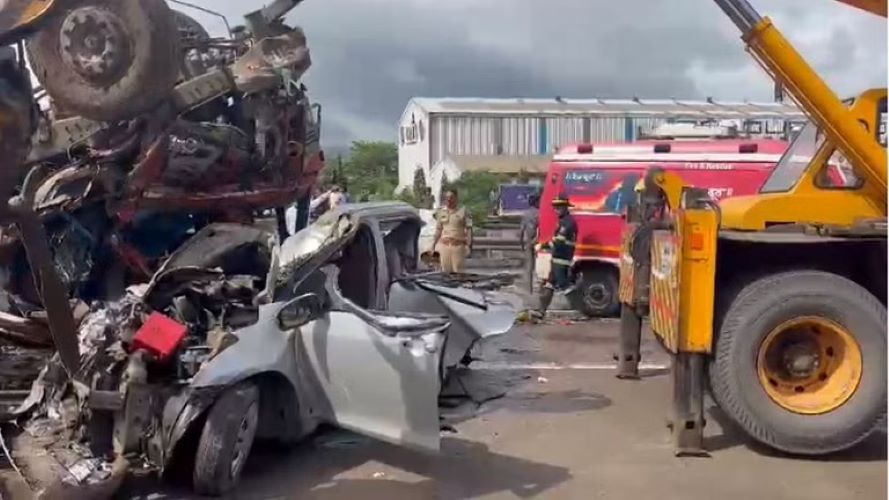 मिळालेल्या माहितीनुसार, आज सकाळी 9 च्या सुमारास अपघातग्रस्त कंटेनर (एमएच-46, एआर 0181) पुण्याहून मुंबईच्या दिशेनं जात होता. यावेळी चालकाचं वाहनावरील नियंत्रण सुटल्याने कंटेनरने एका स्विफ्ट डिझायर कारला धडक दिली. ही धडक एवढी जोरदार होती की, कारचा चक्काचूर झाला. अपघातानंतर कंटेनर विरुद्ध लेनवर जाऊन पलटी झाला. यावेळी समोरून येणारी इतर 4 वाहनं बाधित झाली. या अपघातात स्विफ्ट डिझायरच्या चालकासह एका महिलेचा मृत्यू झाला. तर 4 महिला जखमी झाल्या.