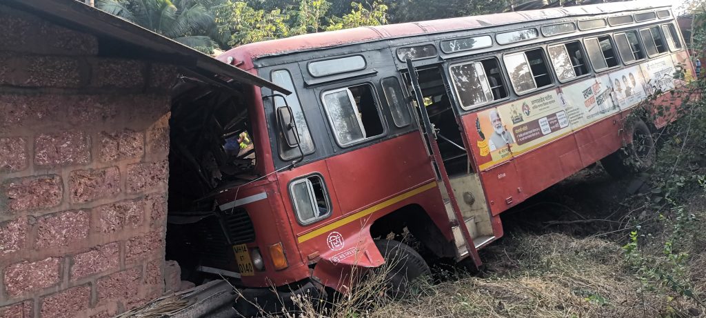 आचरा येथून दुपारी दोनच्या सुमारास खुडी मार्गे देवगडला जाणारया गाडीच्या वाहकाचा गाडीवरील ताबा सुटल्याने एसटी बस रस्ता सोडून खाली उतरत पोयरे गोंदापूर येथील संजय सावंत यांच्या घराला धडकली. सदर घटना दुपारी २.३०च्या सुमारास घडली. या एसटी बसमधून सुमारे 22 प्रवासी प्रवास करत होते. यात शाळेतून घरी येणाऱ्या शाळकरी मुलांची संख्या जास्त होती. सुदैवाने त्यांना किरकोळ दुखापती झाल्या. मात्र , गाडी चालक यात गंभीर जखमी झाला होता. त्याला आचरा वैद्यकीय केंद्रातून ओरोस येथे हलविण्यात आले.