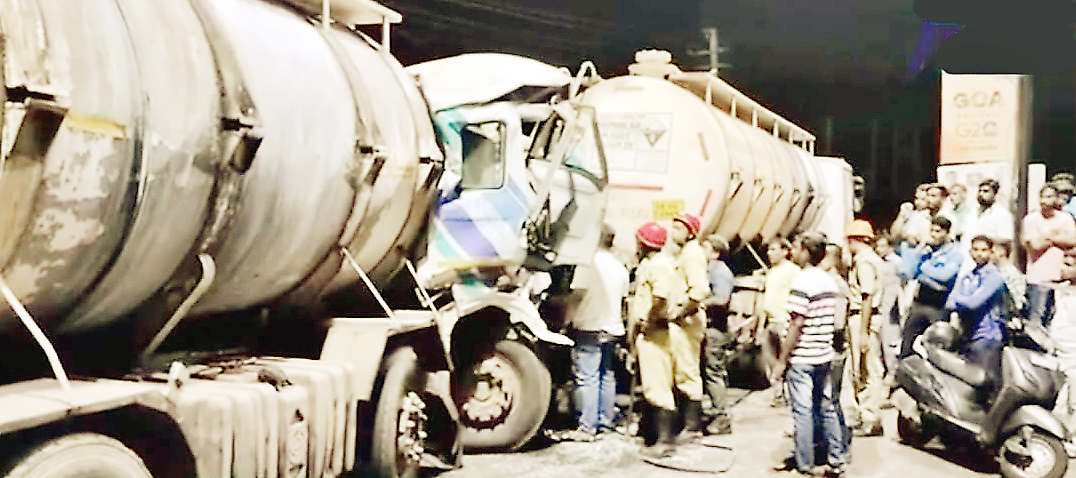 वास्को : आल्त दाबोळीतील नौदलाच्या डेपोसमोरील नाक्यावर दुचाकी स्वारांना वाचवण्याच्या प्रत्यनात अॅसिडवाहू टँकरांचा अपघात झाला. यात एका टँकरचा चालक गंभीर जखमी झाला. हा अपघात शुक्रवारी पहाटे दोनच्या सुमारास घडला. सुदैवाने या अपघातात अॅसिड गळती टळली. अधिक माहितीनुसार वास्को शहरातून फॉसफेरीक असिडने भरलेले दोन टँकर झुआरीनगरातील पारादीप फॉसफेट या कंपनीच्या दिशेने एकामागोमाग निघाले होते. पहाटे दोनच्या सुमारास आल्त दाबोळीतील नौदलाच्या डेपोसमोरील नाक्यावर अचानक एक स्कुटर त्यांच्यासमोर आडवी आली. त्यामुळे पहिल्या टँकर चालकाला अचानक ब्रेक लावणे भाग पडले. टँकर चालकाने ब्रेक लावल्याने ती स्कुटर टँकरच्या धडकेपासून वाचली. मात्र, पुढचा टँकर अचानक थांबल्याने मागच्या टँकरने समोरील टँकरला मागून धडक दिली. त्यामुळे त्या टँकरच्या प्रथमदर्शनी भागाची पूर्णपणे हानी झाली. पूर्णपणे चेपल्या गेलेल्या टँकरच्या केबिनमध्ये त्या टँकरचा चालकही चिरडला गेला. या अपघातामुळे पहाटेच्या वेळीही लोक घटनास्ळी जमा झाले. या अपघाताची माहिती अग्नीशामक दलाला देण्यात आली. अग्नीशामक दलाने पाऊण तासाच्या प्रयत्नाने टँकरच्या केबिनमध्ये चिरडला गेलेल्या चालकाला बाहेर काढले. कटरच्या साहाय्याने पत्रा व लोखंड कापून चालकाला मोकळे करावे लागले. टँकर चालकाचे पाय या अपघात फ्रॅक्चर झाले आहेत. जी स्कुटर आडवी आल्याने हा अपघात झाला, त्या स्कुटरवर तिघे युवक होते. टँकरचालकाने ब्रेक लावल्याने ती तिघेही वाचले. परंतु मागच्या टँकरचा वेग जास्त असता तर दाबोळीत पहाटेच्या वेळी अॅसिड गळती झाली असती. वास्को पोलीस या अपघात प्रकरणी अधिक तपास करीत आहेत.