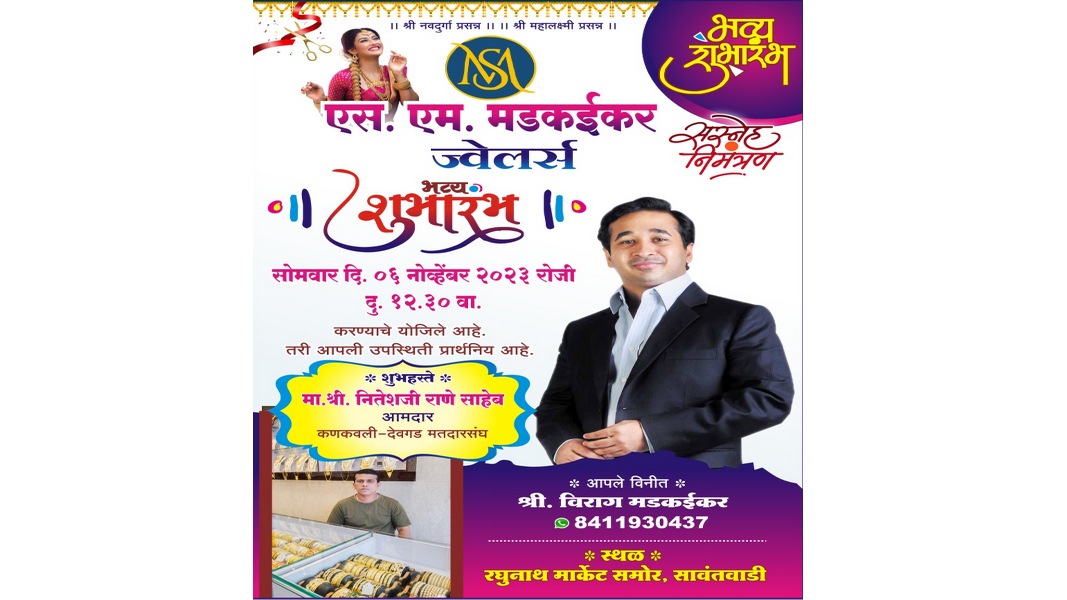 सावंतवाडी व कुडाळ येथील सुप्रसिद्ध सुवर्णकार मडकईकर ज्वेलर्सच्या वन ग्रॅम गोल्ड दागिन्यांचे नवे दालन सावंतवाडी उभाबाजार रघुनाथ मार्केट समोर सुरू करण्यात येत आहे. या दालनाचा शुभारंभ उद्या 6 नोव्हेंबरला दुपारी 3.30 वाजता भाजपाचे युवा नेते आमदार नितेश राणे यांच्या हस्ते करण्यात येत आहे. यावेळी सर्वांनी उपस्थित रहावे असे आवाहन विराग मडकईकर व वैष्णवी मडकईकर यांनी केले आहे.