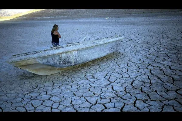 Misha McBride looks at a formerly sunken boat now on cracked earth hundreds of feet from what is now the shoreline on Lake Mead at the Lake Mead National Recreation Area, Monday, May 9, 2022, near Boulder City, Nev. Las Vegas is being flooded with lore about organized crime after a second set of human remains emerged within a week from the depths of the drought-stricken Colorado River reservoir just a 30-minute drive from the notoriously mob-founded Strip. (AP Photo/John Locher)