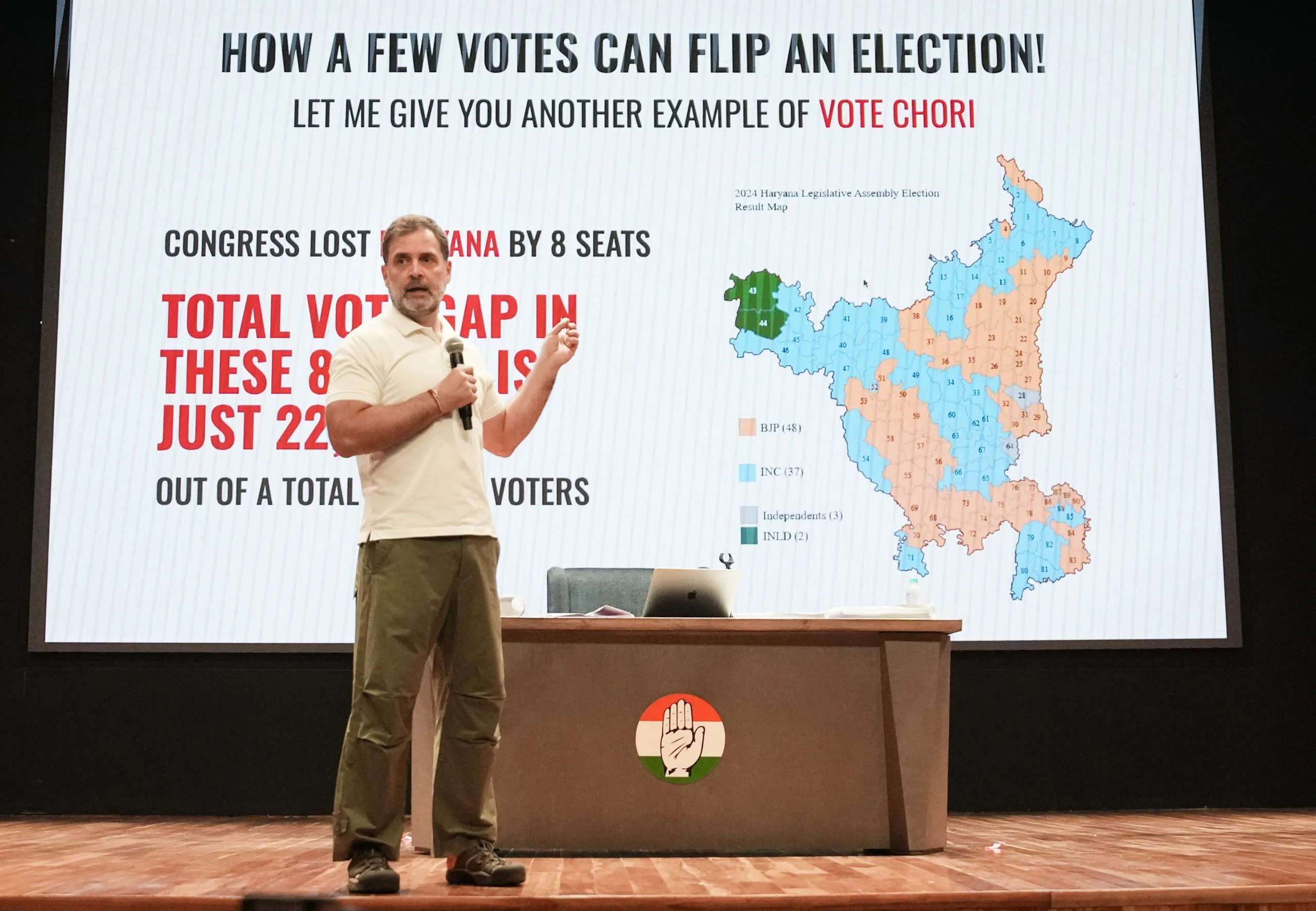 काँग्रेस नेते राहुल गांधी यांनी पुन्हा एकदा केंद्रीय निवडणूक आयोगावर भारतीय जनता पक्षासाठी निवडणूक ‘चोरल्या’चा आरोप केला आहे. त्यांनी यासाठी बेंगळूर मध्य या लोकसभा मतदारसंघाचे उदाहरण दिले असून या मतदारसंघात मोठ्या प्रमाणात बनावट मतदारांची नोंदणी करण्यात आल्याचे प्रतिपादन केले. मात्र, निवडणूक आयोगाने हे सर्व आरोप पुन्हा एकदा ठामपणे फेटाळले आहेत. आपल्या आरोपांच्या पुष्ट्यार्थ गांधी यांनी गुरुवारी पत्रकार परिषद आयोजित करुन आपल्या म्हणण्याचे सादरीकरण केले. त्यांनी मतदारसूचीतील काही नावांचा उल्लेख पुरावे म्हणून केला. एका मतदाराने आपल्या घराचा क्रमांक शून्य असा दिला आहे, असे गांधी यांचे म्हणणे आहे. या म्हणण्याच्या आधारावर त्यांनी हा निवडणूक चोरल्याचा आरोप आयोगावर केला असून आयोगाला आव्हान दिले.