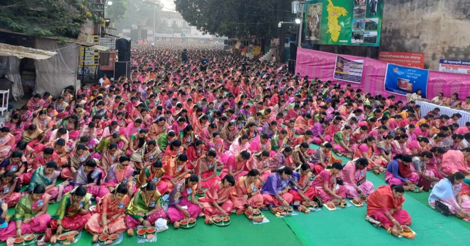महालक्ष्मी अन्नछत्र सेवा ट्रस्ट आयोजित महाकुंकुमार्चन सामुदायिक उपासनेसाठी अंबाबाई मंदिराच्या दक्षिण दरवाजाजवळ आकर्षक मंडप उभारला होता. मंडपात अंबाबाईच्या मूर्ती, श्रीयंत्रासह छत्रपती शिवाजी महाराज व राजर्षी शाहू महाराजांचे पुतळे विराजमान केले होते. त्यांना मेवेकरी यांनी पुष्पहार अर्पण करुन कुंकमार्चन सोहळ्याला सुरुवात केली. या सोहळ्याची पार्श्वभूमी सांगतांना ट्रस्टचे अध्यक्ष राजू मेवेकरी म्हणाले, अंबाबाई मंदिरात देवीच्या मूर्तीची पुनर्प्रतिष्ठापना करुन 300 वर्षे पूर्ण झाल्याचे औचित्यावर 2015 साली कुंकुमार्चन विधी आयोजनला प्रारंभ केला. जातींच्या भींती झुगारुन देत समाजातील सुवासिनींना सोहळ्यात मानाने स्थान देतो आहे. गेल्या वर्षी पाच हजारावर सुवासिनी कुंकुमार्चनाचा विधी केला होता. यंदाच्या वर्षी 6 हजार सुवासिनी सोहळ्यात सहभागी असल्याचे मेवेकरी म्हणाले.