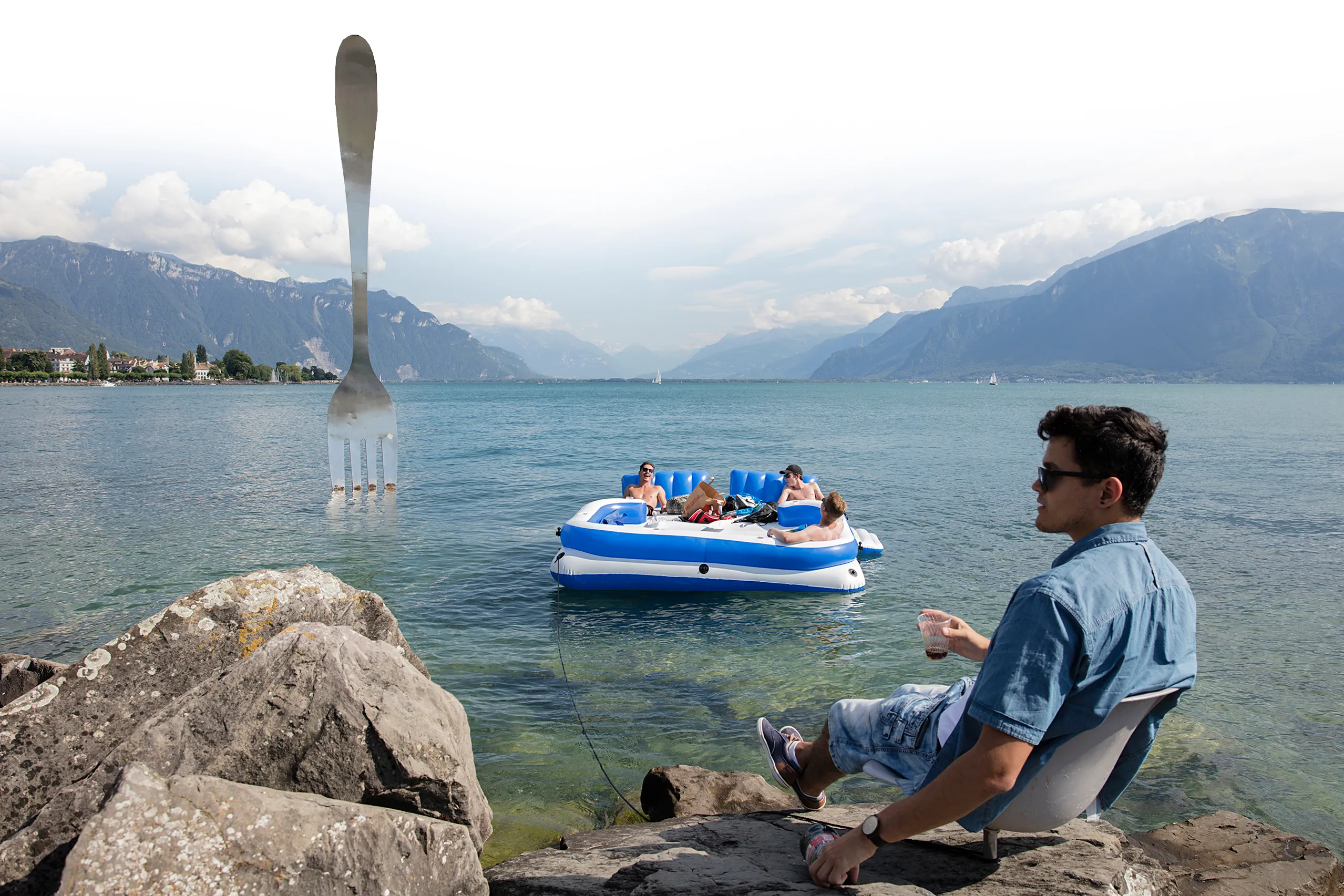या अनोख्या फोर्कला स्वीस कलाकार जीन-पियरे जौग यांनी 1995 मध्ये एलिमेंटेरियमच्या 10 व्या स्थापनादिनामित्त तयार केले होते. फोर्क 1996 मध्ये हटविण्यात आला होता, परंतु एका सार्वजनिक याचिकेनंतर सुमारे 1 दशकाने तो पुन्हा सरोवरात रोवण्यात आला. एकेकावेळी वेवेचा फार्क जगातील सर्वात मोठा फोर्क ठरला होता.