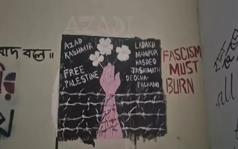 पश्चिम बंगालच्या जादवपूर विद्यापीठातील भिंतीवर आझाद काश्मीर आणि फ्री पॅलेस्टाइनचे चित्र (ग्रॅफिटी) तयार करण्यात आले आहे. 10 मार्च रोजी परीक्षा सुरू असताना ही ग्रॅफिटी तयार करण्यात आली आहे. या पार्श्वभूमीवर पोलिसांनी तेथे दाखल होत तपास सुरू केला आहे. याप्रकरणी डाव्या पक्षांशी संबंधित विद्यार्थी संघटनेच्या समर्थकांच्या विरोधात एफआयआर नेंदविण्यात आला आहे. विद्यापीठातील एक प्राध्यापक सत्तारुढ तृणमूल काँग्रेसशी संबंधित असल्याचे बोलले जात आहे. विद्यापीठाच्या प्रवेशद्वारानजीकच्या भिंतीवर चित्र काढण्यात आले तसेच फॅसिस्ट शक्तींना संपविले जावे असा मजकूर त्यावर आहे. चित्र काढण्यामागे कुठल्या संघटनेचा हात आहे हे अद्याप स्पष्ट झालेले नाही.