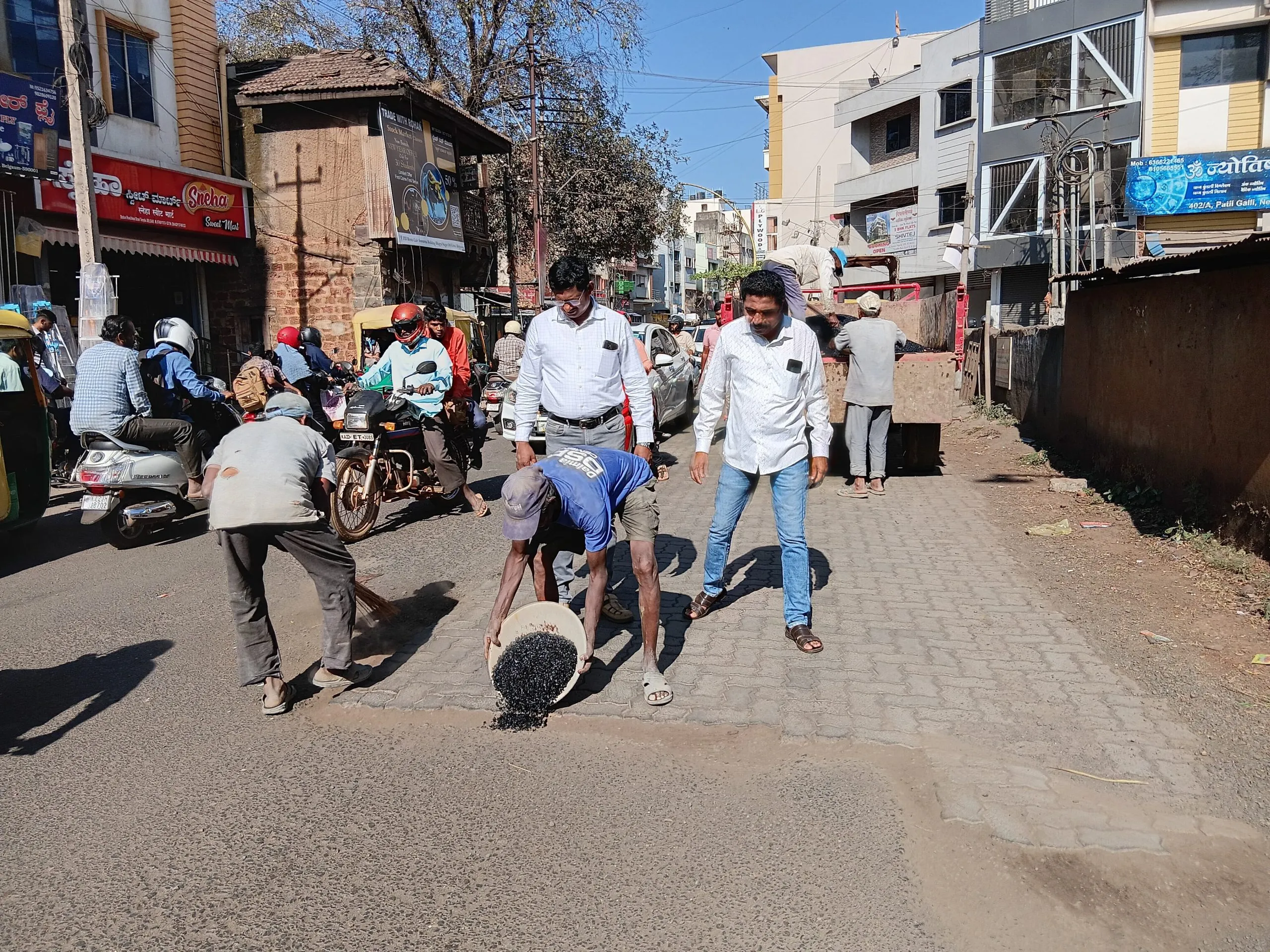 बेळगाव : शनिमंदिर समोर बसविण्यात आलेल्या पेव्हर्सच्या चोहोबाजूंनी धोकादायक चरी निर्माण झाल्या होत्या. त्यामुळे याची दखल घेत नगरसेविका वैशाली भातकांडे यांनी ही बाब मनपाच्या निदर्शनास आणून दिली. त्यानुसार गुरुवार दि. 30 रोजी धोकादायक चरींमध्ये डांबर टाकण्यात आल्याने नागरिकांतून समाधान व्यक्त केले जात आहे. शनिमंदिर समोरील रस्त्यावर काही दिवसांपूर्वी पेव्हर्स बसविण्यात आले होते. मात्र, यावरून वाहनांची कायम वर्दळ असते. त्यामुळे पेव्हर्सच्या चोहोबाजूने धोकादायक चरी निर्माण झाल्या होत्या. त्यामध्ये शालेय विद्यार्थी व वाहनचालक धोकादायक प्रवास करत होते. त्यामुळे त्या चरींमध्ये काँक्रिट किंवा डांबर घालण्यात यावे, अशी मागणी केली जात होती. ही बाब गांभीर्याने घेत नगरसेविका वैशाली भातकांडे यांनी मनपाकडे पाठपुरावा केल्याने गुरुवारी सदर ठिकाणी डांबर घालण्यात आला. यावेळी समाजसेवक सिद्धार्थ भातकांडे व इतर नागरिक उपस्थित होते.