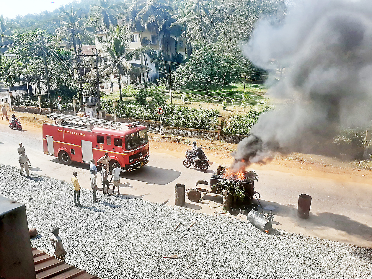 फोंडा : फोंडा-पणजी महामार्गावरील वारखंडे येथील फोंडा अग्निशामक दलासमोर रस्त्याचे काम सुरू असताना अचानक डांबर वितळणाऱ्या मशिन पेट घेतल्याने भर दुपारी गोंधळ उडाला. फोंडा अग्निशामक दलाने तातडीने घटनास्थळी धाव घेऊन आग विझवण्यात महत्चाचे मदतकार्य केले. सदर घटना काल गुरूवारी दुपारच्या सुमारास घडली. वारखंडे येथील अंगारकी इमारतीसमोर रस्ता रूदीकरण व डांबरीकरणाचे काम भर दुपारी सुरू होते. डांबर वितळण्याचे मशिनात डांबरचे बॅरल डांबर वितळण्यासाठी ठेवले होते. अतिउष्णतेमुळे अचानक मशिनने पेट घेतला. कामगारांनी आग विझवण्याचा प्रयत्न असफल ठरला. काहीवेळातच आगीने रौद्र रूप धारण केले. भर रस्त्यावर आगीचे लोट सर्वत्र पसरले. कंत्राटदारांनी त्वरीत अग्निशामक दलाला पाचारण केल्याने परिस्थिती आटोक्यात आणली.