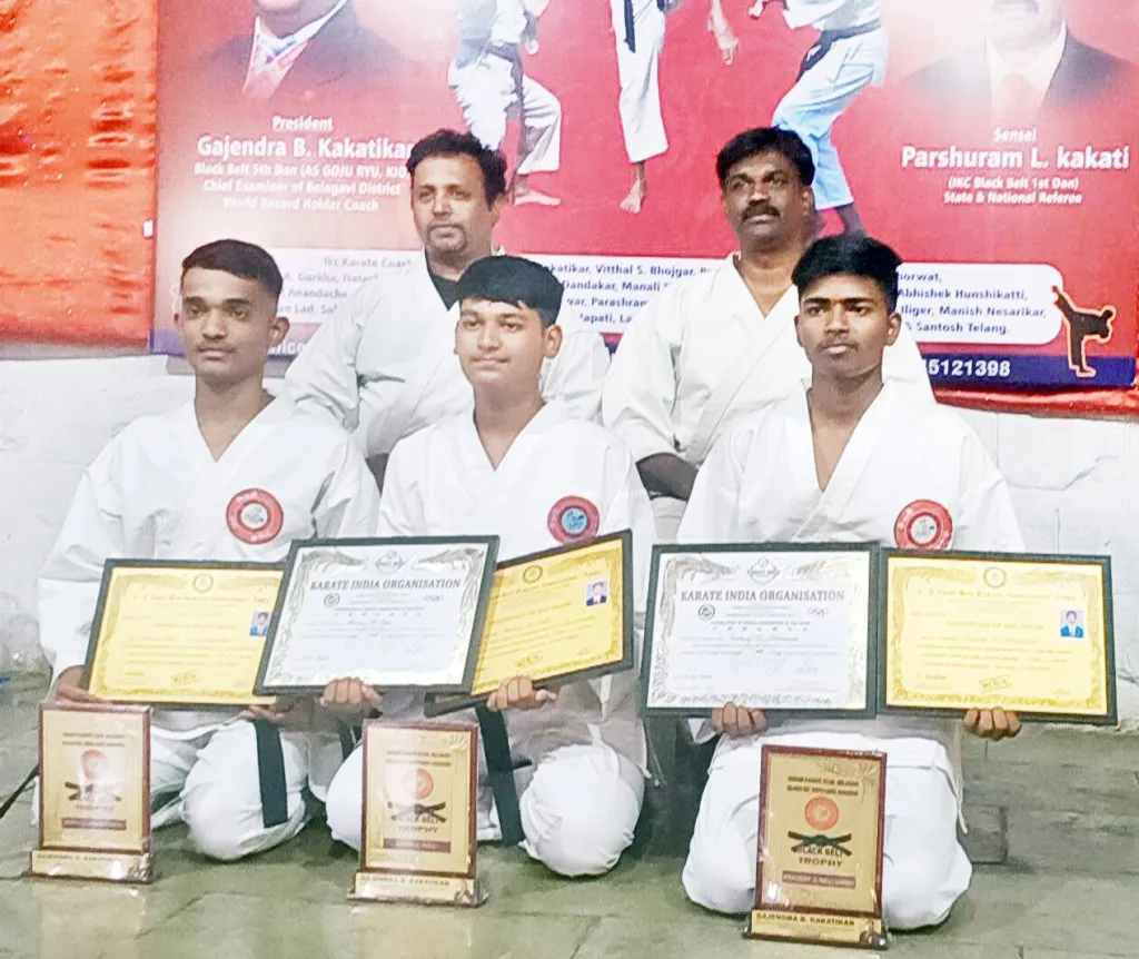 बेळगाव : मुचंडी येथील औदुंबर मंगल कार्यालय येथे घेण्यात आलेल्या कराटे बिल्ड परीक्षामध्ये उत्तीर्ण झालेल्या तीन कराटेपटूंना ब्लॅक बेल्ट देऊन गौरविण्यात आले. य् ाा परीक्षेमध्ये एकूण 94 कलर बेल्टसाठी कराटेपटूंनी सहभाग घेतला होता. तर तीन कराटेपटूंनी ब्लॅक बेल्ट परीक्षेत सहभाग घेतला होता. पार्थ चौगुले पाटील, प्रदीप वल्लुवाईन व अद्वय पाटील यांनी ब्लॅक बेल्ट परीक्षेत उत्तीर्ण झाले. प्रमुख पाहुणे शेखर कोलजिगौडा, गजेंद्र काकतीकर, सिद्धू वडियार, पिराजी घसारी, मदन आनंदाचे आदी मान्यवरांच्या हस्ते ब्लॅक बेल्ट, स्मृतिचिन्ह, प्रमाणपत्र देऊन गौरविण्यात आले. तर त्यांच्या पालकांचाही शाल, श्रीफळ देऊन गौरविण्यात आले. य् ाावेळी कराटे प्रशिक्षक परशराम काकती यांचे वरील तिन्ही खेळाडूंना बहुमोल्य मार्गदर्शन लाभले आहे. यावेळी इंडियन कराटेक्लबचे प्रशिक्षक हेमलता काकतीकर, विठ्ठल भोसगार, प्रभाकर किल्लेकर, निलेश गुरखा, हरीश सोनार, लक्ष्मीकांत आनंदाचे, रितू चौगुले, संजू गस्ती, आदित्य तळवार, ओमकार कावेथिया यांनी विशेष परिश्रम घेतले.
