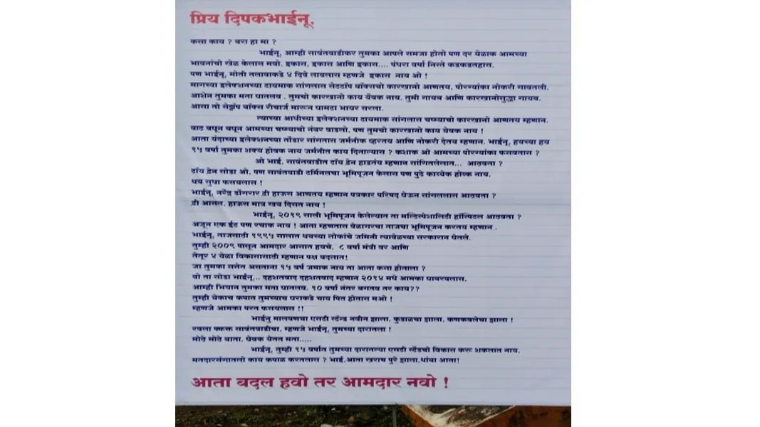 आता बदल हवो तर आमदार नवो हवो अशा आशयाचे बॅनर शुक्रवारी मध्यरात्री अज्ञाताने सावंतवाडी शहरात ठीक ठिकाणी लावले. शालेय शिक्षणमंत्री दीपक केसरकर यांच्या विरोधात असे असलेले हे बॅनर होते .परवानगी न घेता हे बॅनर लावण्यात आल्याने शिवसेना शिंदे गटाचे कार्यकर्ते आक्रमक झाले. त्यांनी पोलीस निरीक्षक अमोल चव्हाण यांची भेट घेऊन शालेय शिक्षण मंत्री दीपक केसरकर यांची बदनामी करणारे बॅनर लावणाऱ्या व्यक्तीवर कारवाई करण्यात यावी अशी मागणी शिवसेना शिंदे गटाने केली आहे. यावेळी शिवसेनाप्रमुख अशोक दळवी ,महिला आघाडी प्रमुख नीता सावंत कविटकर, उपनगराध्यक्ष राजन पोकळे, तालुकाप्रमुख नारायण राणे, शहर प्रमुख हेमराज कुडतरकर ,उपतालुकाप्रमुख गजानन नाटेकर, भारती मोरे ,अनारोजिन लोबो ,विनायक दळवी ,आधी मोठ्या संख्येने कार्यकर्ते उपस्थित होते . मालवणी भाषेतून या बॅनर वर मजकूर होता. प्रिय दीपक भाईनु असा उल्लेख करत या बॅनर मधून केसरकर यांनी गेल्या पंधरा वर्षात मतदारांना दिलेल्या आश्वासनांचा पोलखोल करण्यात आला. केसरकर यांनी अनेक आश्वासने दिली . परंतु, त्यांची पूर्तता झाली नाही . केसरकारांकडून मतदारांची फसवणूकच झाली असल्याचे चित्र या बॅनर मधून उभे करण्यात आले आहे. आगामी विधानसभा निवडणुकीच्या पार्श्वभूमीवर हे बॅनर लावण्यात आल्याने तो चर्चेचा विषय ठरला आहे. तसेच मतदारांना बदल हवा तर आमदार नवा हवा असे आवाहन करण्यात आले आहे. हे बॅनर नगरपालिका प्रशासनाने सकाळी हटवले. त्यानंतर शिवसेना शिंदे गटाने निरीक्षक अमोल चव्हाण यांची भेट घेऊन बॅनर लावणाऱ्या व्यक्तीवर कारवाई करण्याची मागणी केली आहे. केसरकर यांची बदनामी करण्यासाठी हा प्रकार करण्यात आला आहे . अशी बदनामी आम्ही खपवून घेणार नाही. प्रसंगी कायदा हातात घेऊ . असा इशारा शिवसैनिकांनी दिला . तसेच बॅनर वरील मजकूर पाहता त्यावरील भाषाशैली कोणाची हे ओळखता येते. अतृप्त आत्म्यांचा शोध पोलिसांनी घ्यावा. संबंधितावर कारवाई करावी. सावंतवाडीतील वातावरण दूषित करण्याचा हा प्रयत्न आहे. हे सर्वजण बाहेरील आहेत . सीसीटीव्हीच्या आधारे त्यांचा शोध घ्यावा अशी मागणी करण्यात आली आहे .