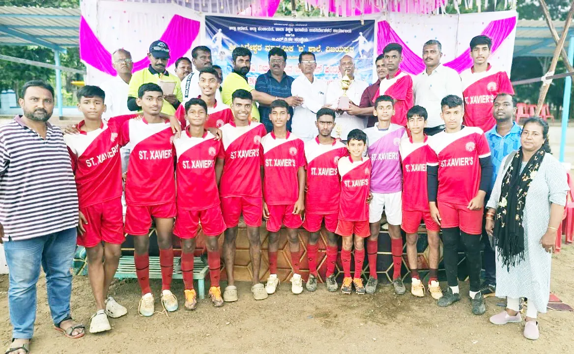 बेळगाव : बेळगाव क्रीडा प्रतिनिधी विजापूर जिल्हा सार्वजनिक शिक्षण खाते आयोजित बेळगाव विभागीय माध्यमिक आंतरशालीय 17 वर्षाखाली मुलांच्या फुटबॉल स्पर्धेचे विजेतेपद बेळगाव जिल्हा संघाचे प्रतिनिधित्व करणाऱ्या सेंट झेवियर्स हायस्कूल संघाने पटकाविले. या स्पर्धेतील उप-उपांत्यपूर्व सामन्यात बेळगाव जिल्हा संघाने हावेरी जिल्हा संघाचा चुरशीच्या सामन्यात 1-0 असा पराभव केला बेळगाव संघातर्फे एकमेव विजयी गोल गौरव गोदवाणी यांनी नोंदविला. उपांत्य पूर्व लढतीत बेळगाव जिल्हा संघाने सर्वोत्कृष्ट खेळाचे प्रदर्शन घडवत चिकोडी जिल्हा संघावर 2-0 असा विजय मिळविला बेळगाव जिल्हा संघातर्फे अरसलन मुल्लाने अप्रतिम खेळ करत 2 गोल नोंदविले. उपांत्य सामन्यात बेळगाव जिल्हा संघाने गदग जिल्हा संघाचा 1-0 असा पराभव करत अंतिम सामन्यात प्रवेश केला. बेळगाव संघाचा एकमेव विजयी गोल तेजसराज निंबनावरने नोंदविला.