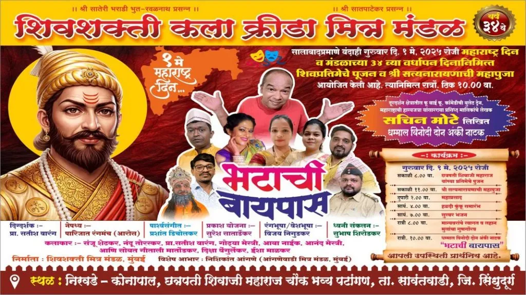 शिवशक्ती कला क्रिडा मित्रमंडळ निरवडे- कोनापाल येथे छत्रपती शिवाजी महाराज चौक पटांगणावर गुरुवार १ मे रोजी सकाळी ८ वाजता छत्रपती शिवाजी महाराज यांच्या प्रतिमेचे पूजन,सकाळी ११ वाजता श्री सत्यनारायण महापूजा,दुपारी २ वाजता महाप्रसाद,सायंकाळी ४ वाजता हळदीकुंकू समारंभ,सायंकाळी ७ वाजता सुस्वर भजन,रात्री ८ वाजता मान्यवरांचे स्वागत व लहान मुलांचा गुणगौरव कार्यक्रम तसेच रात्री १० वाजता धम्माल विनोदी दोन अंकी नाटक ‘ भटाची बायपास ‘ हा नाट्यप्रयोग होणार आहे. लाभ घेण्याचे आवाहन मंडळातर्फे करण्यात आले आहे.