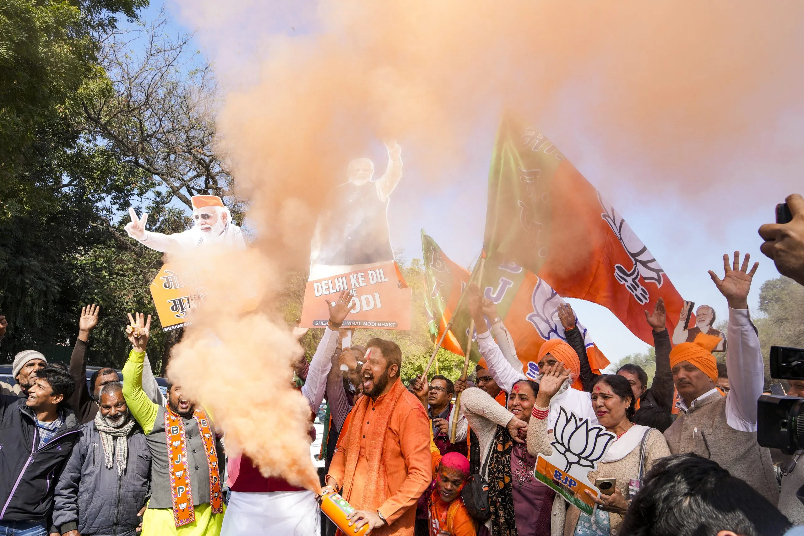 भाजप बहुमताने विजयाकडे वाटचाल करत आहे आणि आम आदमी पक्ष खूप मागे आहे. दरम्यान, भाजपने एक पोस्टर प्रसिद्ध केले आहे, ज्यामध्ये इंडिया गेटवर कमळ फुललेले दिसत आहे.