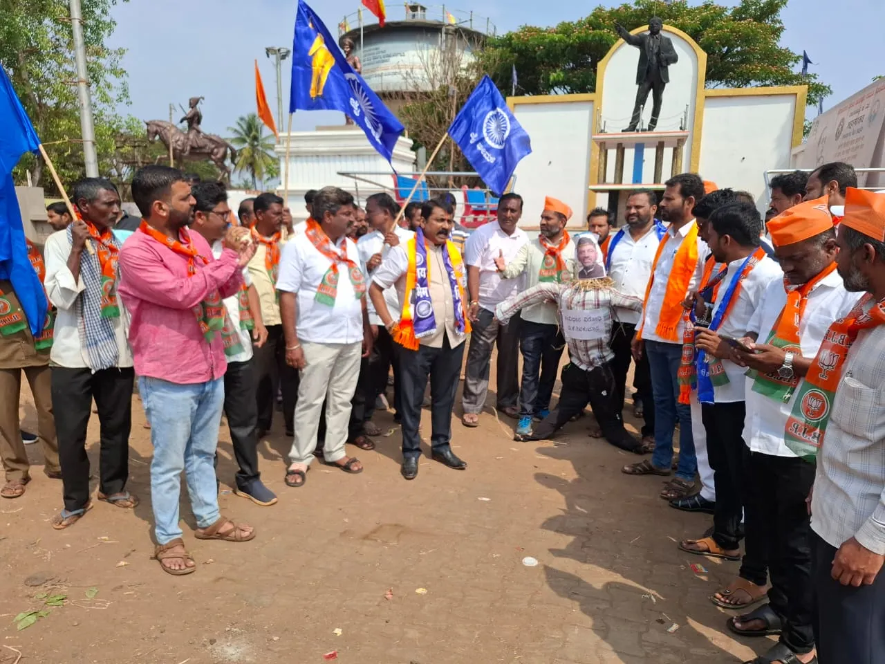 बेळगाव : उपमुख्यमंत्री डी. के. शिवकुमार यांच्या वक्तव्याचे पडसाद मंगळवारी बेळगावमध्ये उमटले. बेळगाव भाजप महानगर व ग्रामीण यांच्यावतीने राज्य काँग्रेसच्या विरोधात जोरदार आंदोलन करण्यात आले. पुतळे जाळून काँग्रेसचा निषेध करण्यात आला. शहर भाजप उत्तर विभागाकडून चन्नम्मा चौक येथे राज्य सरकारविरोधात आंदोलन करण्यात आले. त्याचबरोबर बेळगाव तालुक्यातही अनेक ठिकाणी आंदोलन झाले. माजी आमदार संजय पाटील यांच्या नेतृत्वाखाली ग्रामीण भागात आंदोलन झाले. यावेळी ग्रामीण मंडलचे अध्यक्ष युवराज जाधव, यल्लेश कोलकार, गुरुप्रसाद यांच्या उपस्थितीत आंदोलन झाले. चन्नम्मा चौक येथे मुरुगेंद्रगौडा पाटील, डॉ. रवी पाटील, उज्ज्वला बडवाण्णाचे यांच्या उपस्थितीत आंदोलन झाले. राज्य सरकार व डी. के. शिवकुमार यांच्या विरोधात जोरदार घोषणाबाजी करण्यात आली. यावेळी मोठ्या संख्येने भाजपचे कार्यकर्ते उपस्थित होते.