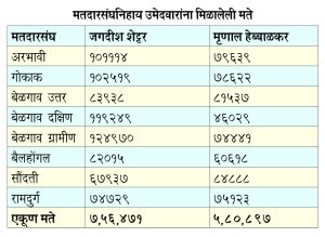 बेळगाव लोकसभा मतदारसंघामध्ये 8 विधानसभा मतदारसंघांचा समावेश असून सकाळी 6 वाजता स्ट्राँगरूम खोलण्यात आले. सकाळी 8 वाजता मतमोजणीला प्रारंभ करण्यात आला. 21 फेऱ्यांमध्ये मतदान प्रक्रिया पूर्ण करण्यात आली. 13 लाख 75 हजार 283 मतदारांनी मतदानाचा हक्क बजावला होता. 13 उमेदवार रिंगणात होते. मतमोजणीला प्रारंभ केल्यानंतर पहिल्या फेरीपासूनच शेट्टर यांनी आघाडी मिळविली होती. ती आघाडी मतमोजणीची प्रक्रिया पूर्ण होईपर्यंत कायम राखली. या मतदारसंघातील निवडणूक भाजप विरुद्ध काँग्रेस अशी थेट झाल्याने निवडणुकीच्या निकालाकडे संपूर्ण जिल्ह्याचे लक्ष लागून राहिले होते. स्थानिक विरुद्ध उपरे असा वाद रंगला होता. त्यामुळे निवडणुकीत रंगत चढली होती. या मतदारसंघातून 13 उमेदवारांनी निवडणूक लढविली असली तरी भाजप विरुद्ध काँग्रेस अशीच ही लढत झाली आहे. दिवंगत खासदार सुरेश अंगडी यांनी बेळगाव लोकसभा मतदारसंघातून चारवेळा विजय संपादन केला होता. यानंतर त्यांच्या पत्नी मंगला अंगडी यांनी पोटनिवडणुकीत विजय मिळविला होता. त्यामुळे ही निवडणूक भाजपसाठी अत्यंत प्रतिष्ठेची होती. माजी मुख्यमंत्री जगदीश शेट्टर हे भाजपचा गड राखण्यात यशस्वी झाले आहेत.