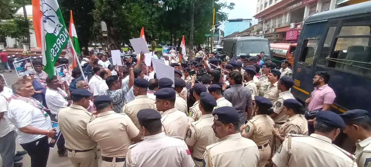 पक्षाचे कार्यकर्ते राज्य मुख्य निवडणूक अधिकाऱ्यांच्या कार्यालयावर जाणार होते. त्यानुसार काँग्रेस हाऊसकडून पोलिस मुख्यालयासमोरून मोर्चा अल्तिनोकडे निघाला असता पोलिसांनी तो अडविला व निदर्शकांना ताब्यात घेतले. विरोधी पक्षनेते युरी आलेमाव, आमदार अल्टन डिकॉस्टा, महिला काँग्रेस अध्यक्ष प्रतिक्षा खलप, यांच्यासह अन्य पदाधिकारी व कार्यकर्त्यांची मोठी उपस्थिती होती. निवडणूक आयोगाने निष्पक्षपणे कार्य करावे आणि ‘मतचोरी’ला थांबवावे, अशी मागणी या मोर्चातून करण्यात आली. सुरक्षा आणि कायदा-सुव्यवस्था राखण्यासाठी हा निर्णय घेतल्याचे पोलिसांचे म्हणणे आहे. नेत्यांनी पोलिसांचा अडथळा पार करण्याचा प्रयत्न केला, मात्र तणाव वाढू नये म्हणून पोलिसांनी त्यांना ताब्यात घेतले. विरोधी पक्षनेते युरी आलेमाव यांनी निवडणूक आयोग ही भाजपची ‘शाखा’ असल्याप्रमाणे काम करत आहे, असा आरोप केला.