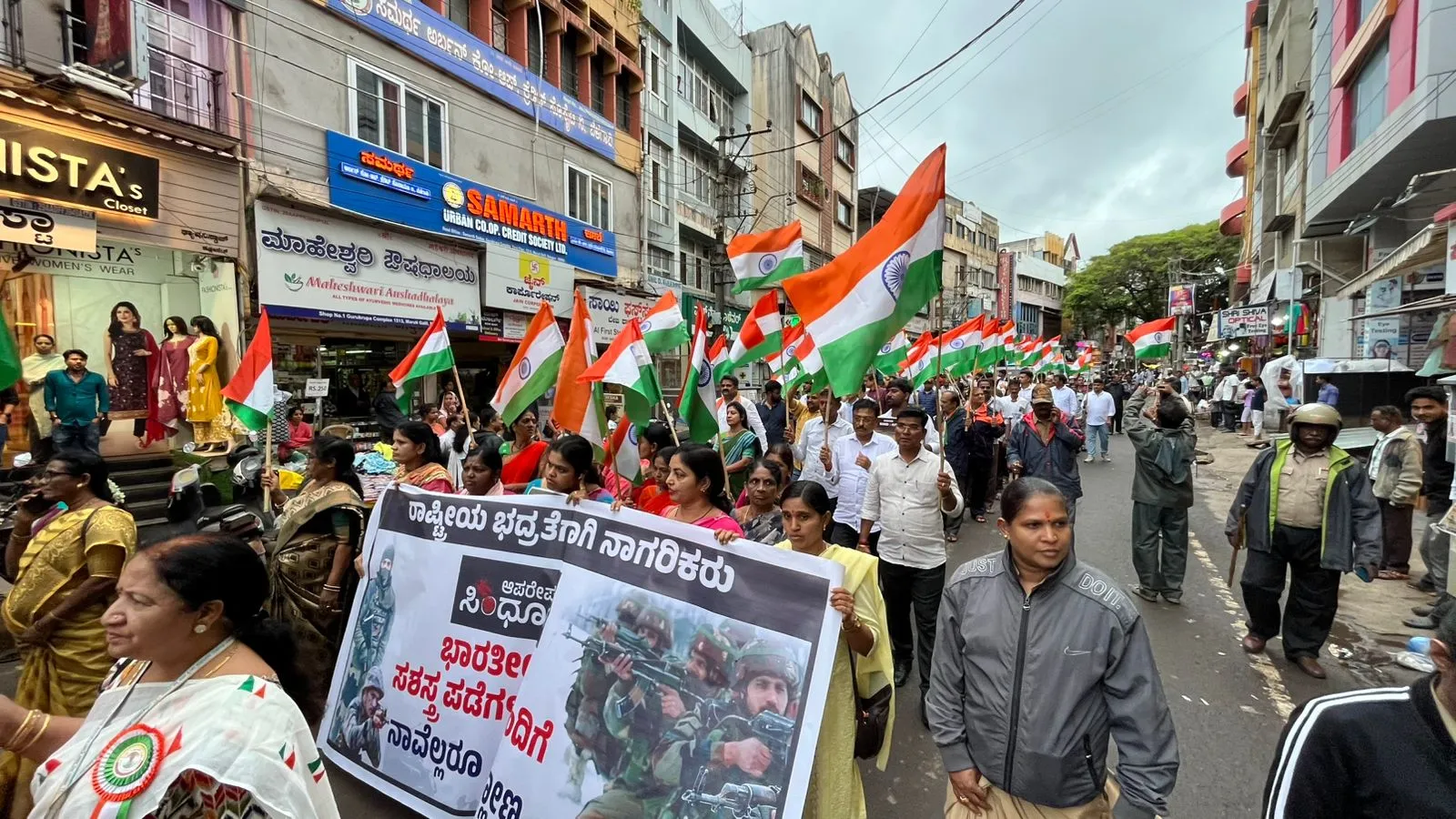 बेळगाव : काश्मीरमधील पहलगाम येथे अतिरेक्यांनी हल्ला केल्याने भारतीय पर्यटकांचा मृत्यू झाला होता. त्यामुळे भारतीय सेनेने ऑपरेशन सिंदूर राबवून दहशतवाद्यांचा खात्मा केला. ऑपरेशन सिंदूर यशस्वी होण्यासह भारतीय सैनिकांचे अभिनंदन करण्यासाठी गुरुवारी भाजपचे राज्य उपाध्यक्ष व माजी आमदार अॅड. अनिल बेनके यांच्या नेतृत्वाखाली भाजपतर्फे शहरात तिरंगा रॅली काढण्यात आली. धर्मवीर संभाजी चौकातून भारतमातेच्या प्रतिमेचे पूजन करून माजी सैनिकांच्या हस्ते तिरंगा रॅलीला सुरुवात करण्यात आली. यावेळी उपस्थित माजी सैनिकांनी भारतीय सेनेचे कौतुक करण्यासह पाकिस्तान व त्यांना मदत करणाऱ्या तुर्कीये व चीन देशांचा निषेध केला. पाकिस्तानला इतर अन्य देशांनी पाठिंबा दिलेला नाही. पाकिस्तानचे चार तुकडे होणार असल्याचे बलुचिस्तान सेनेने सांगितले आहे, असे यावेळी माजी सैनिकांनी सांगितले. हातात तिरंगा ध्वज घेऊन रॅलीतील नागरिक धर्मवीर संभाजी चौक, रामदेव गल्ली, समादेवी गल्ली, मारुती गल्लीमार्गे जाऊन कांबळी खूट येथे रॅलीची सांगता करण्यात आली. यावेळी माजी सैनिक, भाजपचे पदाधिकारी व कार्यकर्ते मोठ्या संख्येने उपस्थित होते.